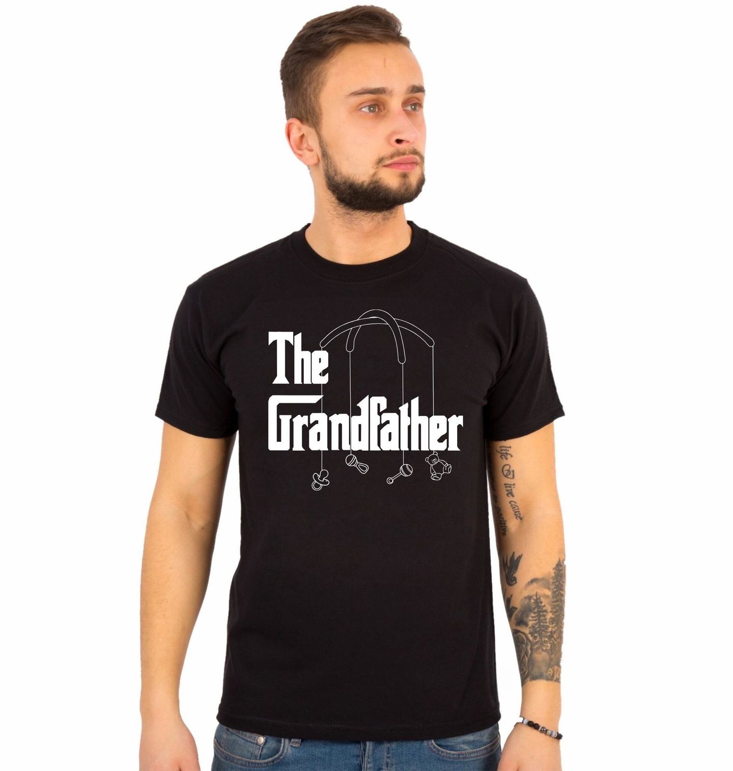 Pánské tričko Dědeček The Grandfather. Ikonická parodie na film „The Godfather“ (Kmotr) s nápisem „The Grandfather“ (Dědeček) kombinuje mafiánskou estetiku s roztomilými dětskými prvky jako chrastítko a plyšák. Ideální design pro hrdé dědečky.