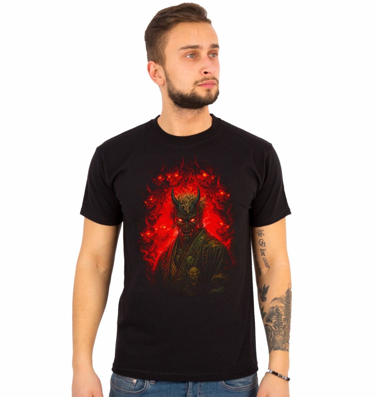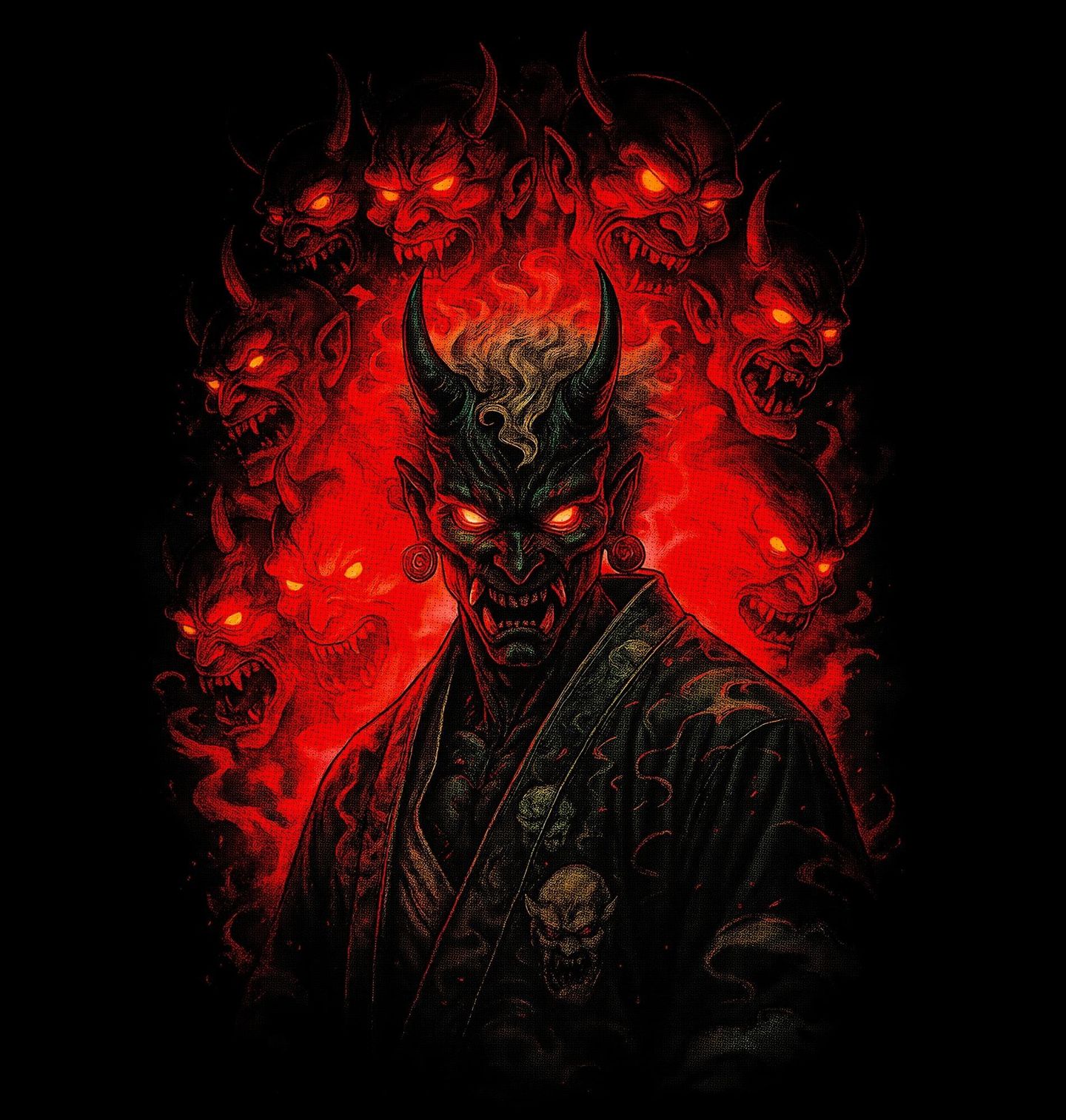 Pánské tričko Démon Oni z Hlubin Pekla. Temný a výrazný motiv zobrazuje legendární japonský démon – oni, bytost známou z mytologie jako symbol chaosu, hněvu a síly. V centru stojí děsivý démon s rohy a planoucím pohledem, obklopený dalšími tvářemi, které vytvářejí atmosféru čistého peklo. Design čerpá inspiraci z japonské kultury, kde oni představuje nejen zlo, ale i trest a vnitřní démony, se kterými člověk bojuje.