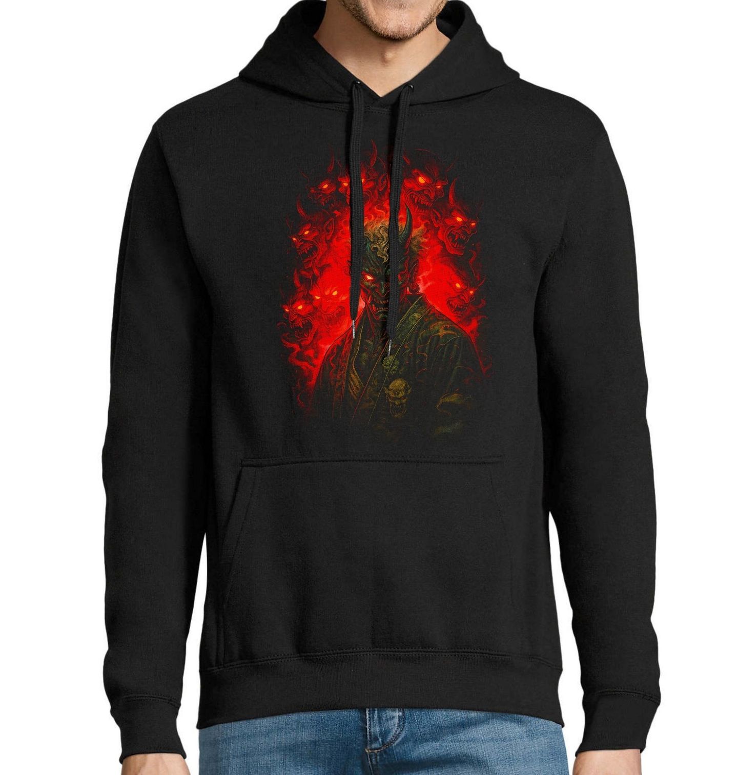 Pánská mikina Démon Oni z Hlubin Pekla. Temný a výrazný motiv zobrazuje legendární japonský démon – oni, bytost známou z mytologie jako symbol chaosu, hněvu a síly. V centru stojí děsivý démon s rohy a planoucím pohledem, obklopený dalšími tvářemi, které vytvářejí atmosféru čistého peklo. Design čerpá inspiraci z japonské kultury, kde oni představuje nejen zlo, ale i trest a vnitřní démony, se kterými člověk bojuje.