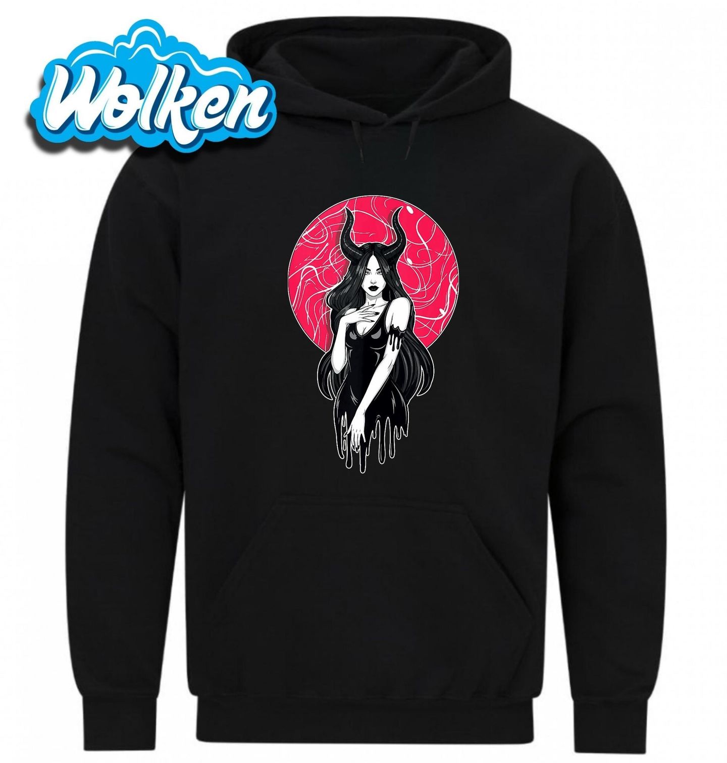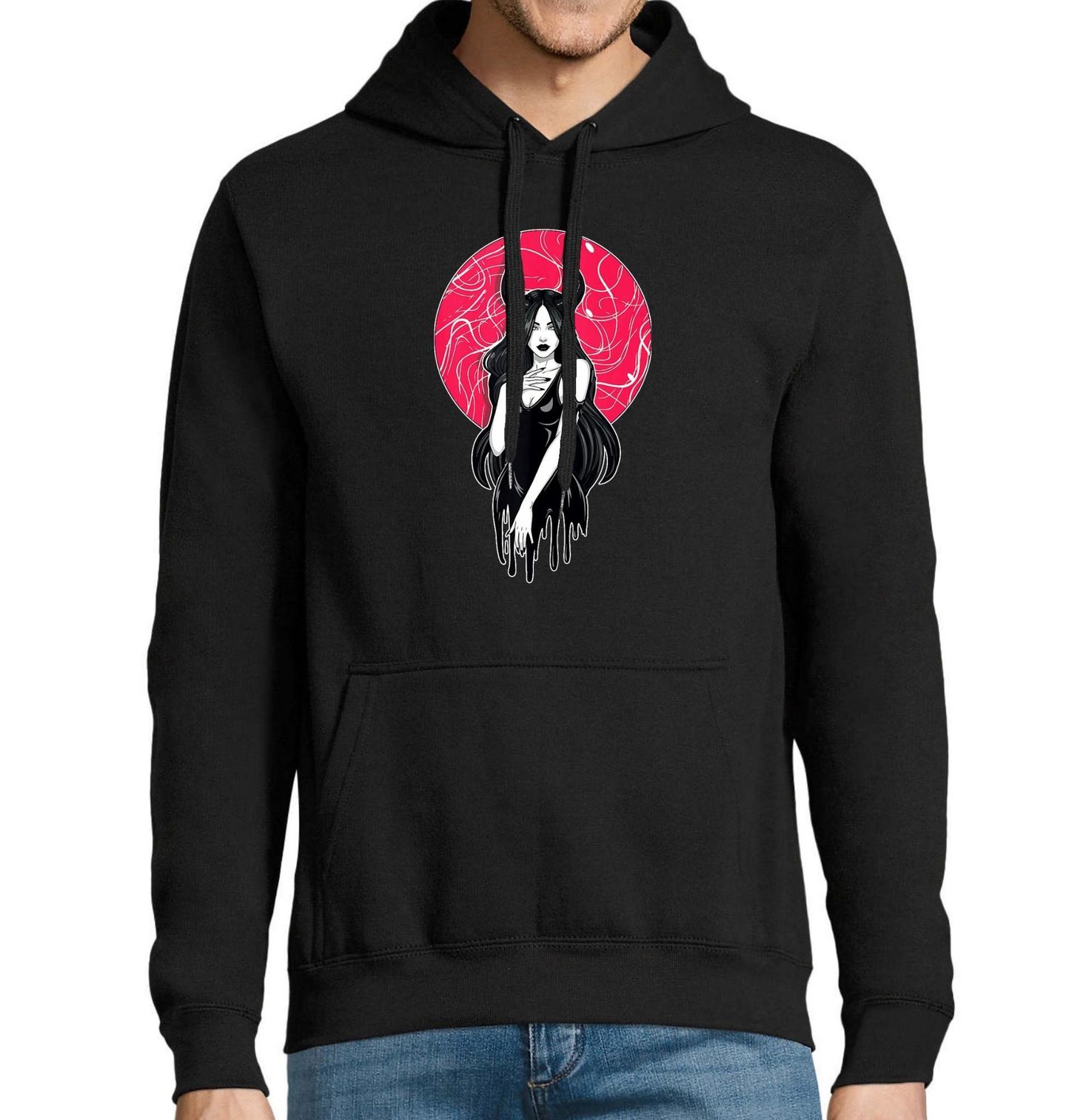 Pánská mikina Démonická Bohyně Lilith. Lilith, známá z mezopotámské a židovské mytologie, je symbolem svobody, vzpoury a ženské síly. V tomto výtvarném zpracování má dlouhé černé vlasy, démonické rohy a oči, které proniknou až do hloubky duše. Rudý kruh za její hlavou připomíná krvavý měsíc a dodává scéně apokalyptickou atmosféru.