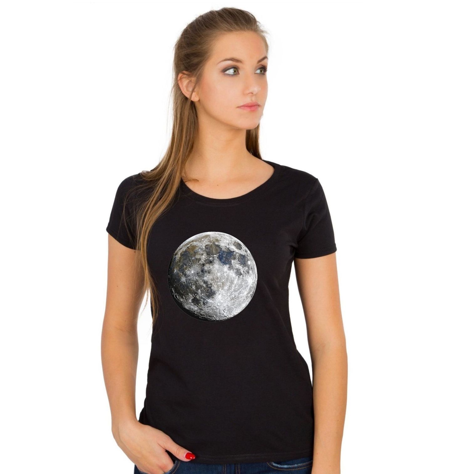 Dámské tričko Detailní Měsíc s Krátery. Jedinečný motiv zobrazující detailní a realistickou podobu měsíce, jak září v nekonečném vesmíru. Každý kráter, světlejší i tmavší oblast je precizně vykreslená, takže motiv působí téměř jako skutečná fotografie z oběžné dráhy. Pokud tě fascinuje vesmír, astronomie, noční obloha a tajemství hvězd, tenhle design je pro tebe jako stvořený.