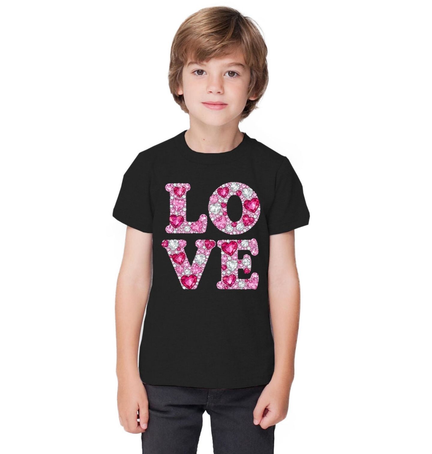 Dětské tričko Diamantová Láska LOVE. Výrazný motiv nápisu LOVE složený z třpytivých drahokamových srdcí v růžových a červených tónech představuje oslavu emocí, romantiky a stylu. Skvěle se hodí pro příležitosti, jako je valentýn, výročí nebo chvíle, kdy chcete vyjádřit city výrazně a beze slov.