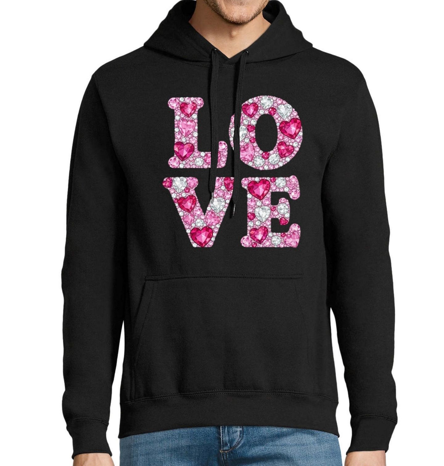 Pánská mikina Diamantová Láska LOVE. Výrazný motiv nápisu LOVE složený z třpytivých drahokamových srdcí v růžových a červených tónech představuje oslavu emocí, romantiky a stylu. Skvěle se hodí pro příležitosti, jako je valentýn, výročí nebo chvíle, kdy chcete vyjádřit city výrazně a beze slov.