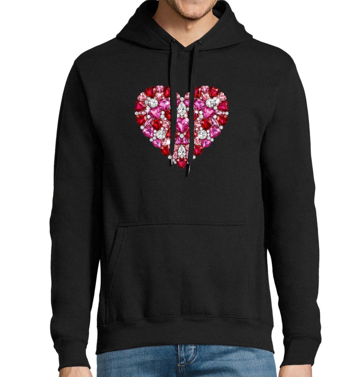 Pánská mikina Diamantové Srdce z Drahokamů. Luxusní motiv ve tvaru třpytivého srdce poskládaného z růžových, červených a bílých drahokamů vyzařuje romantiku, eleganci a opravdovou lásku. Tento design je jako stvořený pro všechny, kteří chtějí zazářit a oslavit Valentýn stylově.