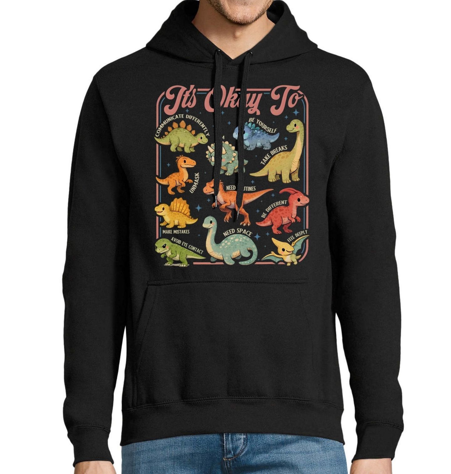 Pánská mikina Dinosauři Je v pořádku být sám sebou. Každý dinosaurus na obrázku představuje jiný způsob chování nebo vnímání světa – a všechny jsou úplně v pořádku. Na motivu jsou barevní dinosauři doplnění o myšlenky jako: Communicate differently, Be yourself, Take breaks, Need routines, Be different, Need space.