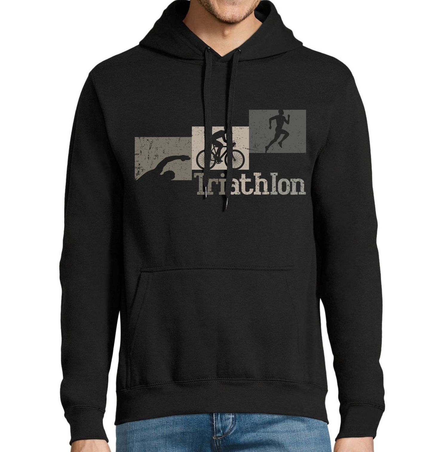 Pánská mikina Disciplíny Triatlonu Plavání Kolo Běh. Stylový sportovní motiv zachycuje tři základní disciplíny, které dohromady tvoří triathlon. Siluety znázorňují plavání, jízdu na kolo a závěrečný běh – přesně v pořadí, jak je zná každý triatlonista. Design vyjadřuje plynulý přechod mezi jednotlivými částmi závodu a symbolizuje vytrvalost, disciplínu a pohyb vpřed.
