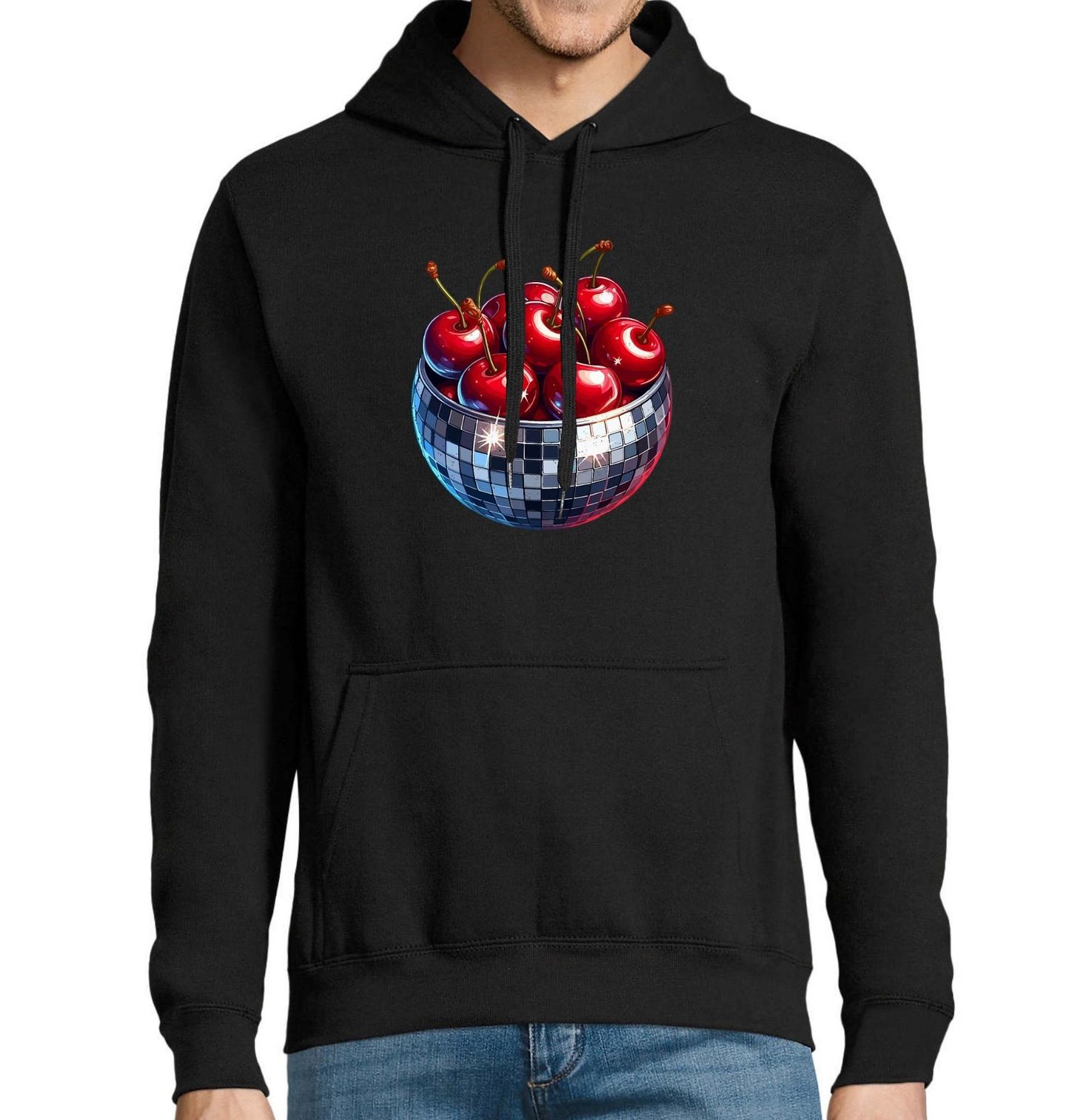 Pánská mikina Disco Třešně. Tento veselý motiv spojuje šťavnaté červené třešně s lesklou disco koulí, takže je ideální pro milovníky retro tancovaček, letní pohody i odvážného designu. Barevný a hravý potisk dodá tvému outfitu energii a nápaditost, ať už jdeš na párty, festival nebo jen chceš rozsvítit všední den.