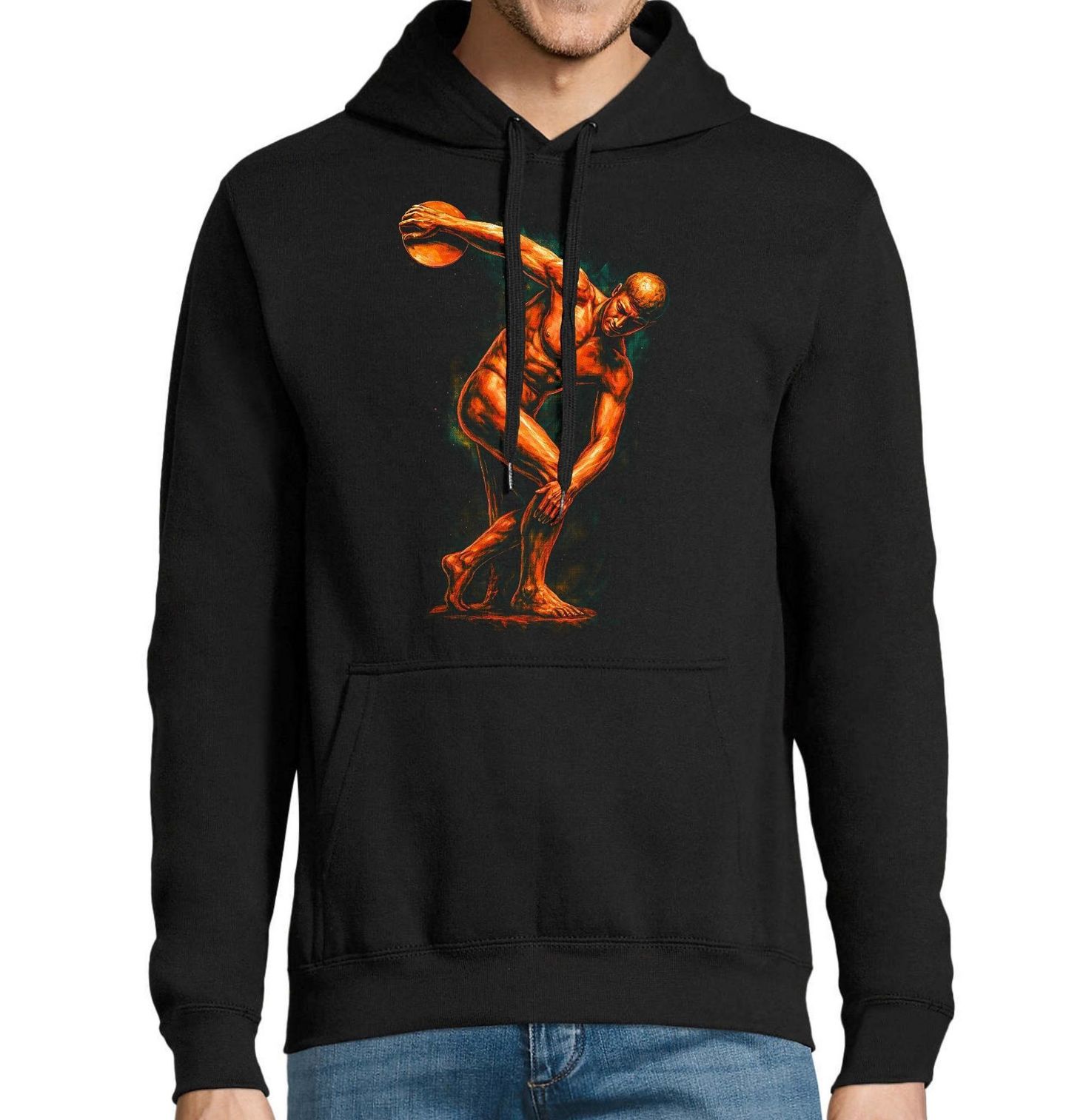 Pánská mikina Diskobolos. Diskobolos starořeckého sochaře Myróna je jedna z nejznámějších antických soch. Jde o akt atletického mladého muže s diskem v ruce, znázorněného v okamžiku napětí a soustředění těsně před hodem. Detailní zpracování svalů a pohybu vytváří dojem energie a napětí, které doslova vystupuje z temného pozadí. Ideální volba pro milovníky historie, sportu, antiky a nadčasového umění.