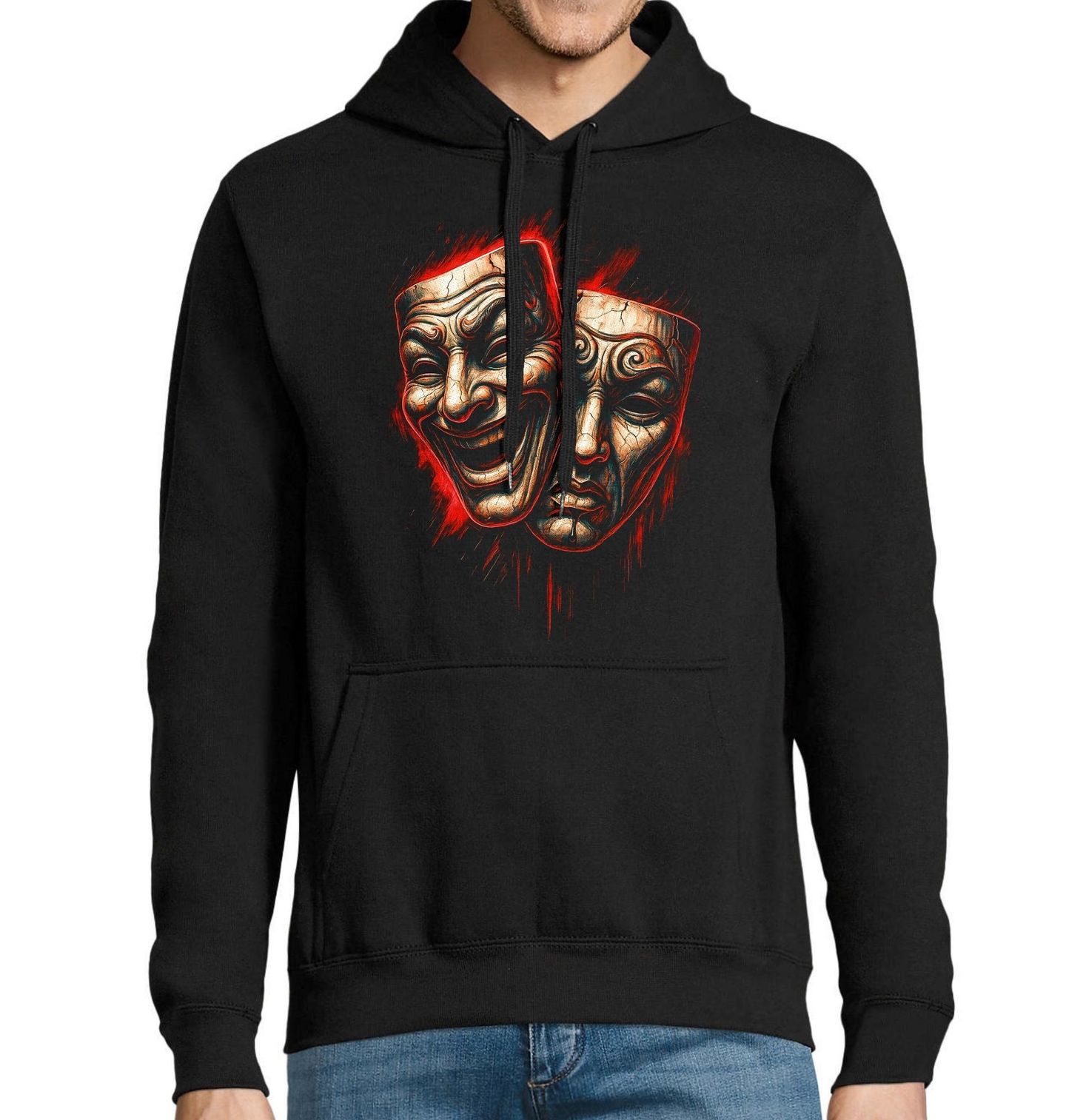 Pánská mikina Divadelní Masky Radost a Bolest. Tento motiv zobrazuje symbol tragédie a komedie, známé divadelní masky, které jsou spojené s kultem boha Dionýsos. Kult boha Dionýsa byl jedním z nejvýraznějších a nejsložitějších náboženských proudů ve starověkém Řecku. Dionýsos byl uctíván jako bůh vína, nespoutaného veselí, plodnosti, divadla a mystérií. Jeho kult se vyznačoval extatickými rituály, divokými tanci a uvolněním společenských zábran.