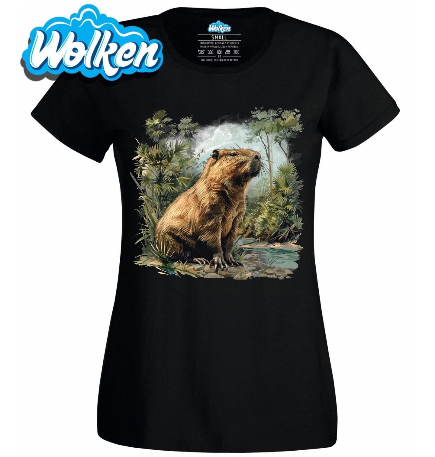Dámské tričko Divoká Kapybara v Přírodě. Kapybara jako pán přírody! Největší hlodavec na světě, v jeho přirozené džunglové scenérii. Krásné ilustrace s tropickými rostlinami a klidnou vodní hladinou dávají motivu atmosféru dobrodružství a svobody. Kapybara je symbolem míru, pohodového života a respektu k přírodě