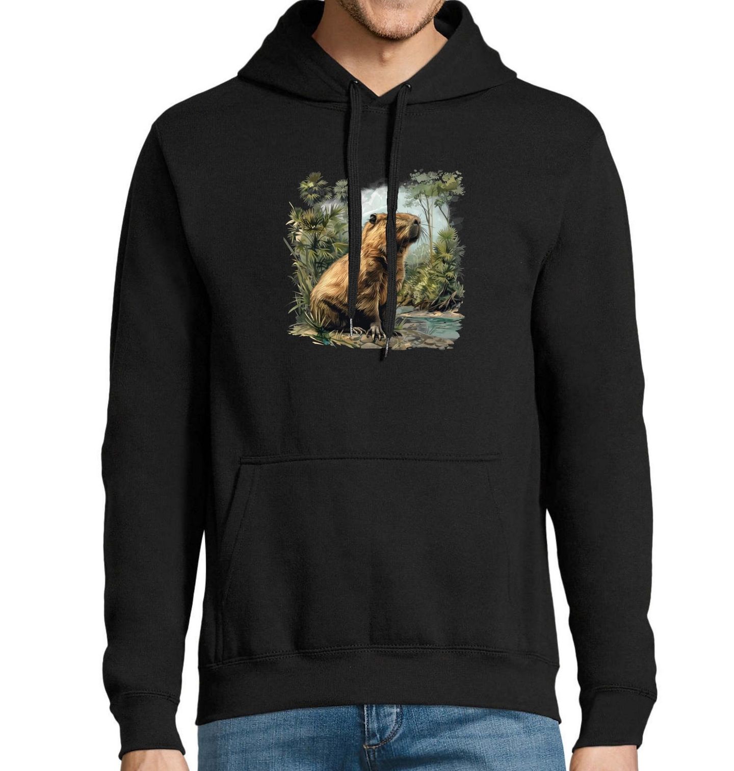 Pánská mikina Divoká Kapybara v Přírodě. Kapybara jako pán přírody! Největší hlodavec na světě, v jeho přirozené džunglové scenérii. Krásné ilustrace s tropickými rostlinami a klidnou vodní hladinou dávají motivu atmosféru dobrodružství a svobody. Kapybara je symbolem míru, pohodového života a respektu k přírodě