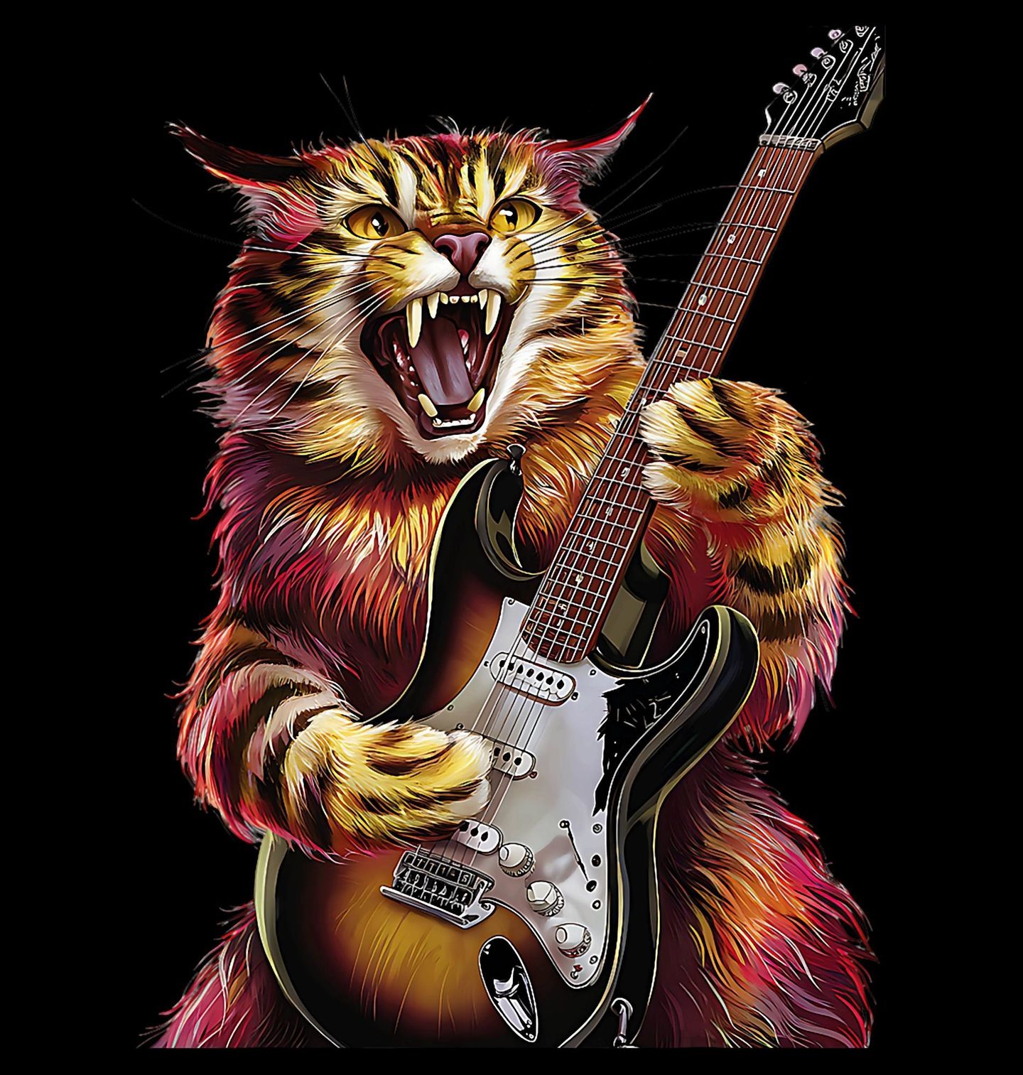 Pánské tričko Divoká Kočka Rocku. Tohle není jen obyčejná kočka – tohle je pravá rocková hvězda s elektrickou kytarou v tlapách! Tento jedinečný motiv spojuje divokou energii šelmy a nespoutanou vášeň pro hudbu. Dokonalý design pro všechny milovníky koček, rocku i pořádných kytarových riffů.