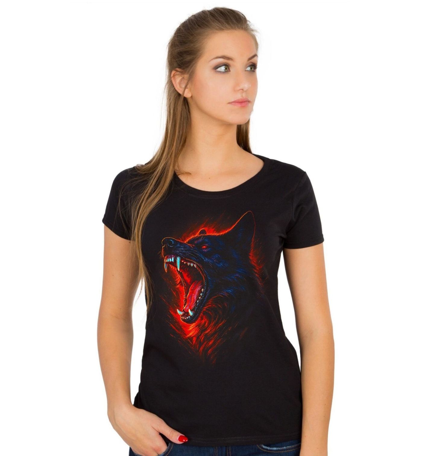 Dámské tričko Divoký Řev Vlka. Divokost, síla a nespoutaná energie – to vše zosobňuje vlk v tomto výrazném a temném motivu. Rozzuřený vlk s rozevřenou tlamou a žhnoucím rudým světlem symbolizuje instinkt, svobodu a nezkrotnou povahu. Kontrast mezi temnou srstí a ohnivými tóny dodává designu dramatický efekt, který okamžitě přitahuje pozornost.