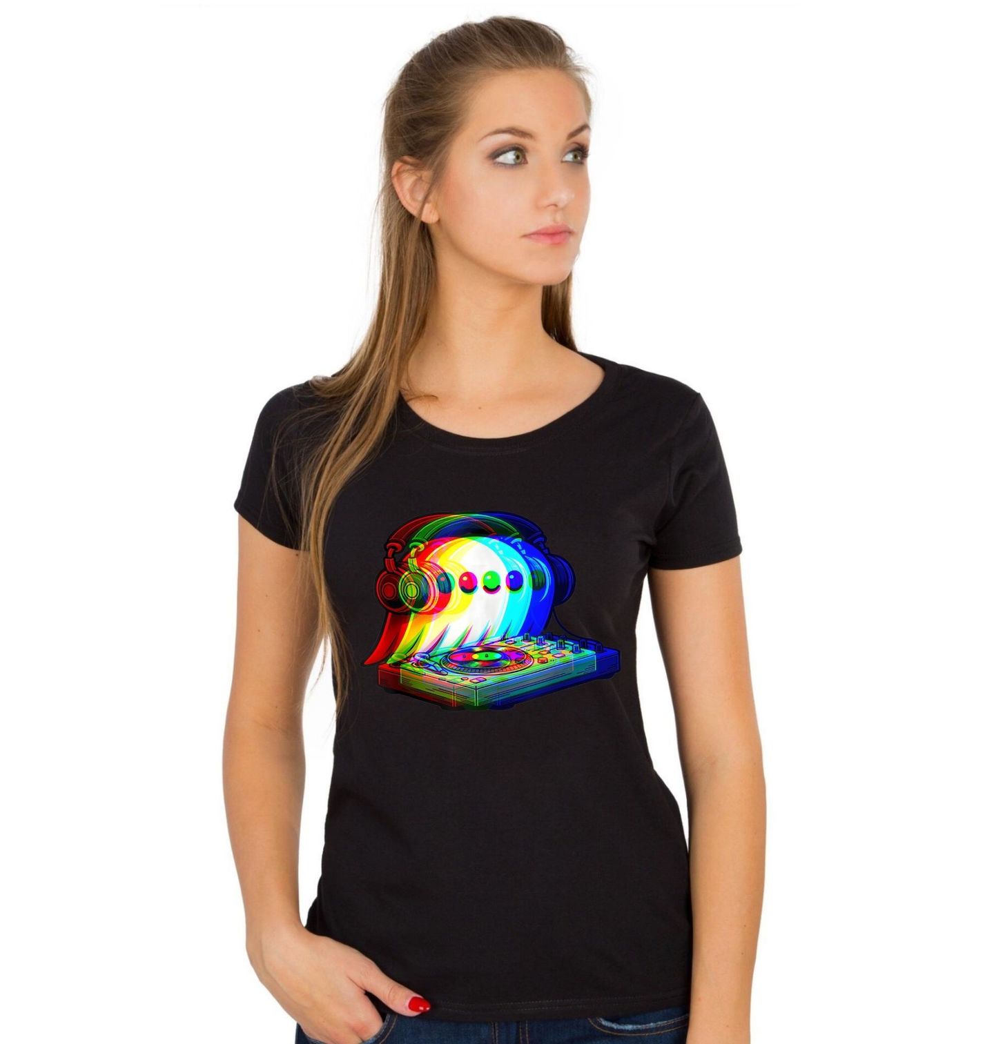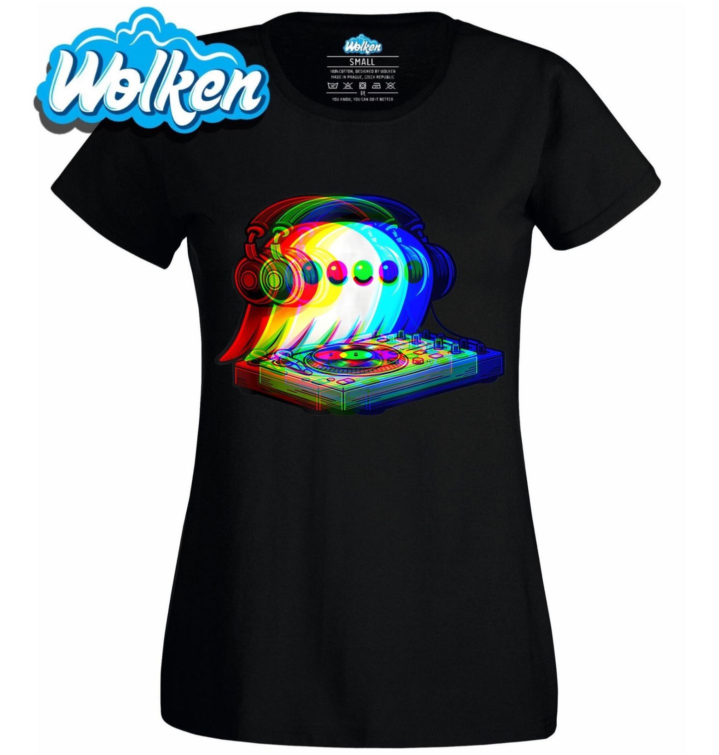 Dámské tričko DJ Duch Glitch Ghost. Tento originální motiv přináší kombinaci barevného ducha za DJ pultem, sluchátka a mixážní konzole. Symbolizuje nekonečnou energii, kterou přináší hudba a párty, kde DJ ovládá atmosféru a roztančí každý dav.