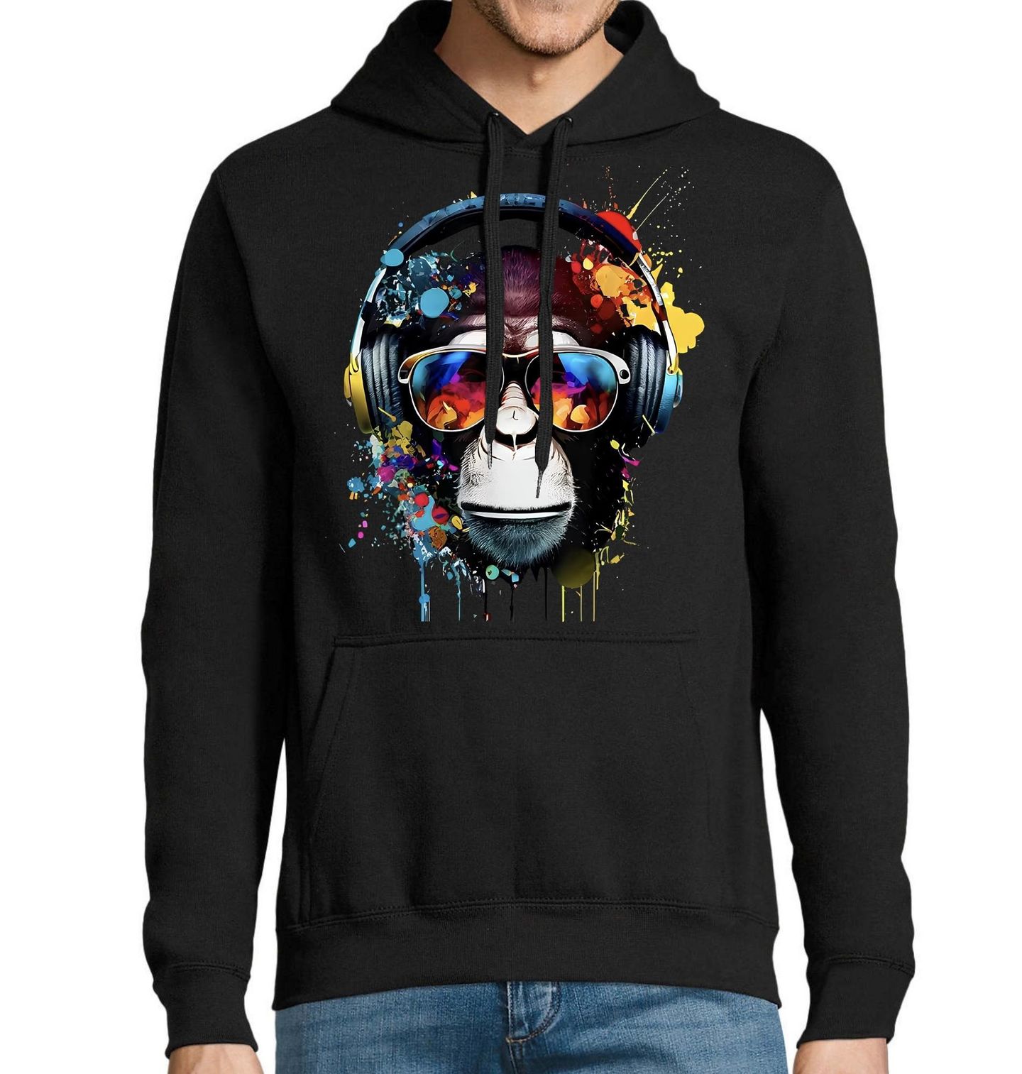 Pánská mikina DJ Opice. Moderní a výrazný motiv zobrazuje stylovou opici se sluchátky a barevnými efekty ve stylu street art. Sluneční brýle a hudební vibe dodávají designu energii a originalitu. Tento motiv opice je ideální pro milovníky hudby, DJ kultury a výrazného stylu.