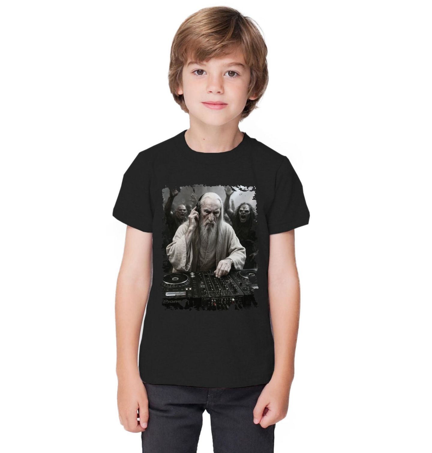 Dětské tričko DJ Saruman. Fantasy motiv zobrazuje mocného čaroděje Saruman v netradiční roli jako DJ za profesionálním mixážním pultem. Soustředěný výraz, epická atmosféra a temná energie vytváří silný vizuální dojem. Za ním stojí skřeti, kteří dodávají scéně syrový a dramatický nádech, jako by se právě odehrávala magická rave párty v srdci temné říše.