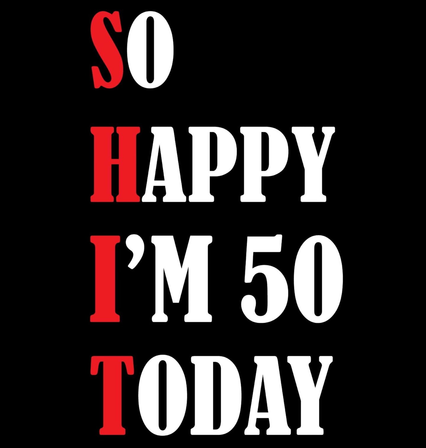 Dámské tričko Dnes Slavím 50! Výrazný typografický design s červenobílým textem „So Happy I’m 50 Today“. Jednoduché a jasné sdělení ideální pro oslavu kulatých narozenin. Text na obrázku: „So Happy I’m 50 Today“ (Jsem tak šťastný/šťastná, že je mi dnes 50). Z prvních písmen je vytvořen červený nápis SHIT. Pro všechny, kdo slaví 50. narozeniny.