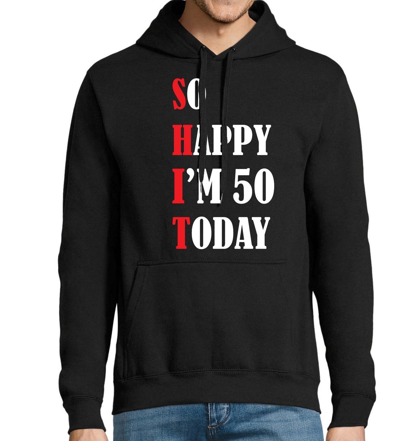 Pánská mikina Dnes Slavím 50! Výrazný typografický design s červenobílým textem „So Happy I’m 50 Today“. Jednoduché a jasné sdělení ideální pro oslavu kulatých narozenin. Text na obrázku: „So Happy I’m 50 Today“ (Jsem tak šťastný/šťastná, že je mi dnes 50). Z prvních písmen je vytvořen červený nápis SHIT. Pro všechny, kdo slaví 50. narozeniny.