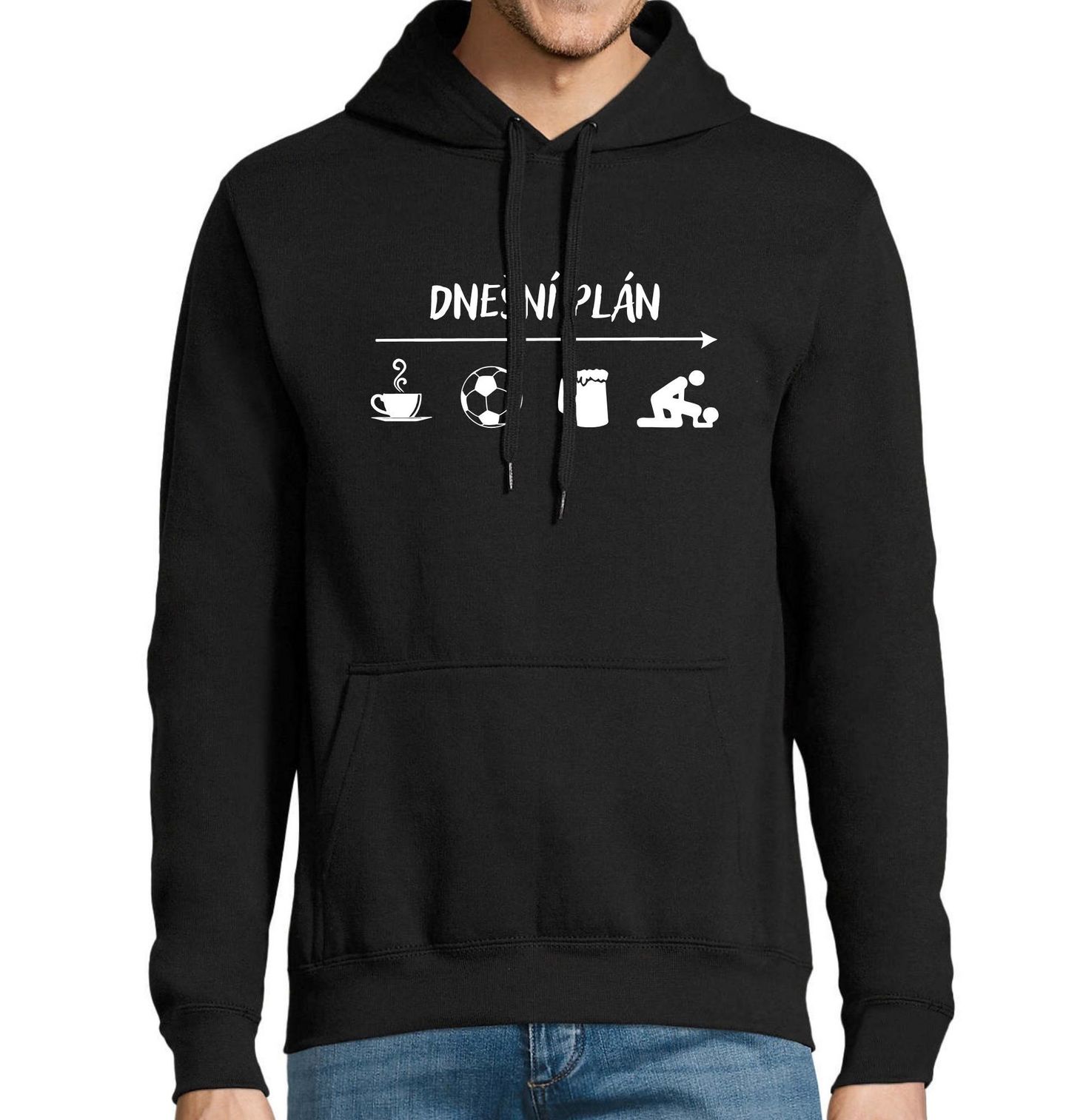 Pánská mikina Dnešní plán: Káva Fotbal Pivo Sex. Tento vtipný motiv je určen pro všechny, kdo si umí užít život, odpočinout si a brát věci s humorem. Ráno nakopne voňavá káva, odpoledne napínavý fotbal, pak zasloužené pivo s partou a nakonec ideální zakončení dne. Co víc si přát?