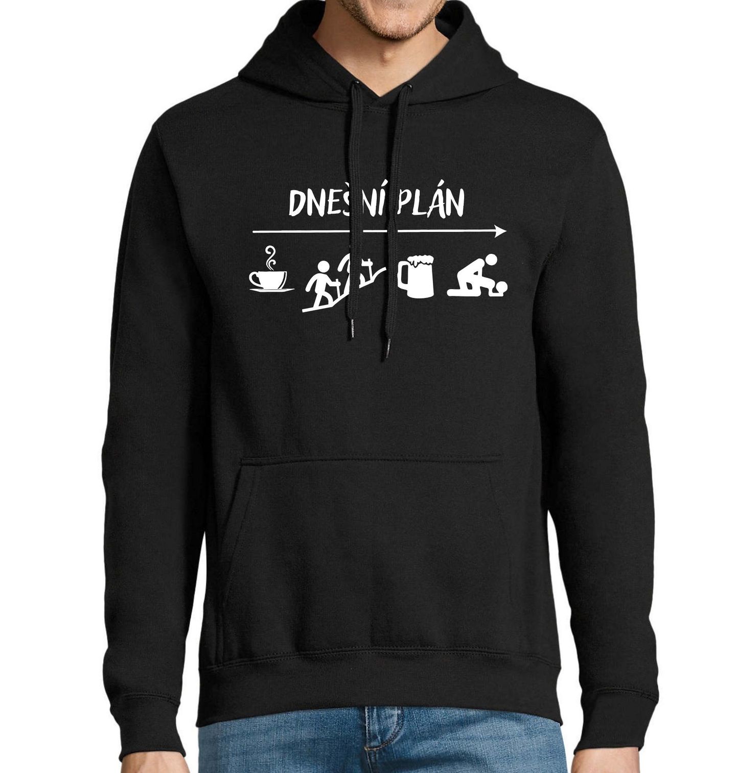 Pánská mikina Dnešní plán: Káva Hiking Pivo Sex. Kdo potřebuje kalendář, když má takhle jasný plán? Začíná to kávou, pokračuje pořádným hikingem, následuje studené pivo a… no, večer už se ví. Motiv pro každého, kdo miluje volnost, hory a trochu nespoutaný životní styl. Protože po dávce kofeinu, kilácích v přírodě a pár půllitrech se i sex počítá jako regenerace.