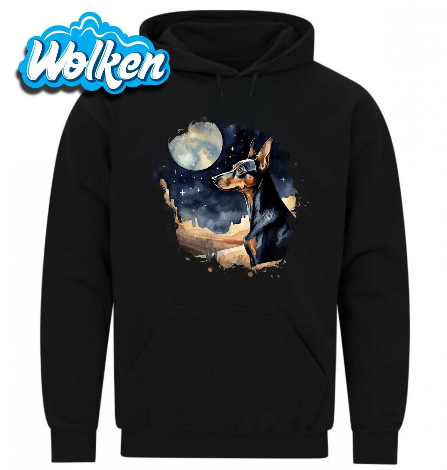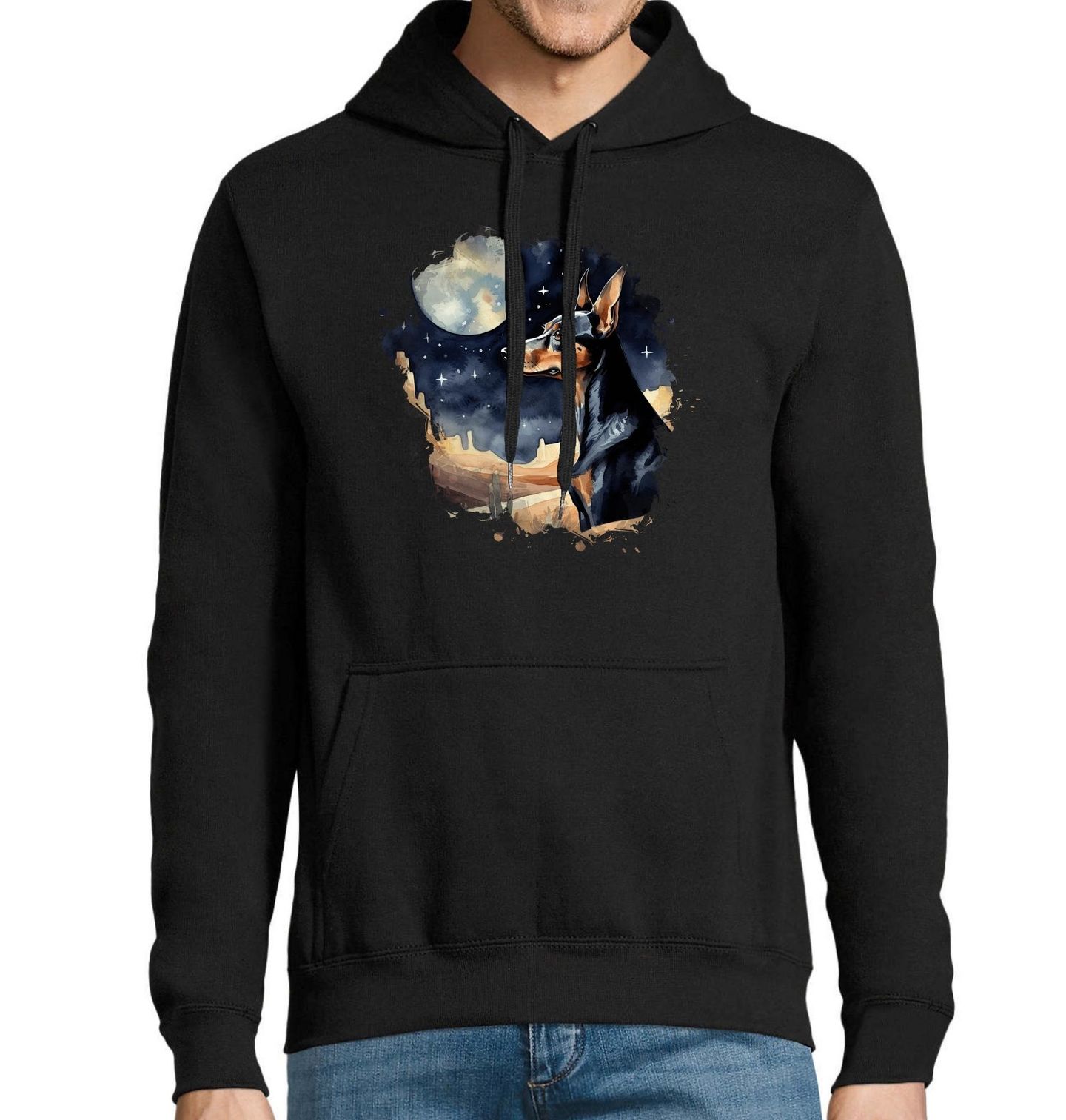 Pánská mikina Dobrman v Noční Poušti. Dobrman je největší z pinčů. Dnes se používá jako služební pes a společník. Temná noční scenérie s měsícem na pozadí podtrhuje ušlechtilý výraz tohoto krásného psa. Motiv je jako stvořený pro každého pejskaře, který obdivuje inteligenci a loajalitu tohoto majestátního plemene.