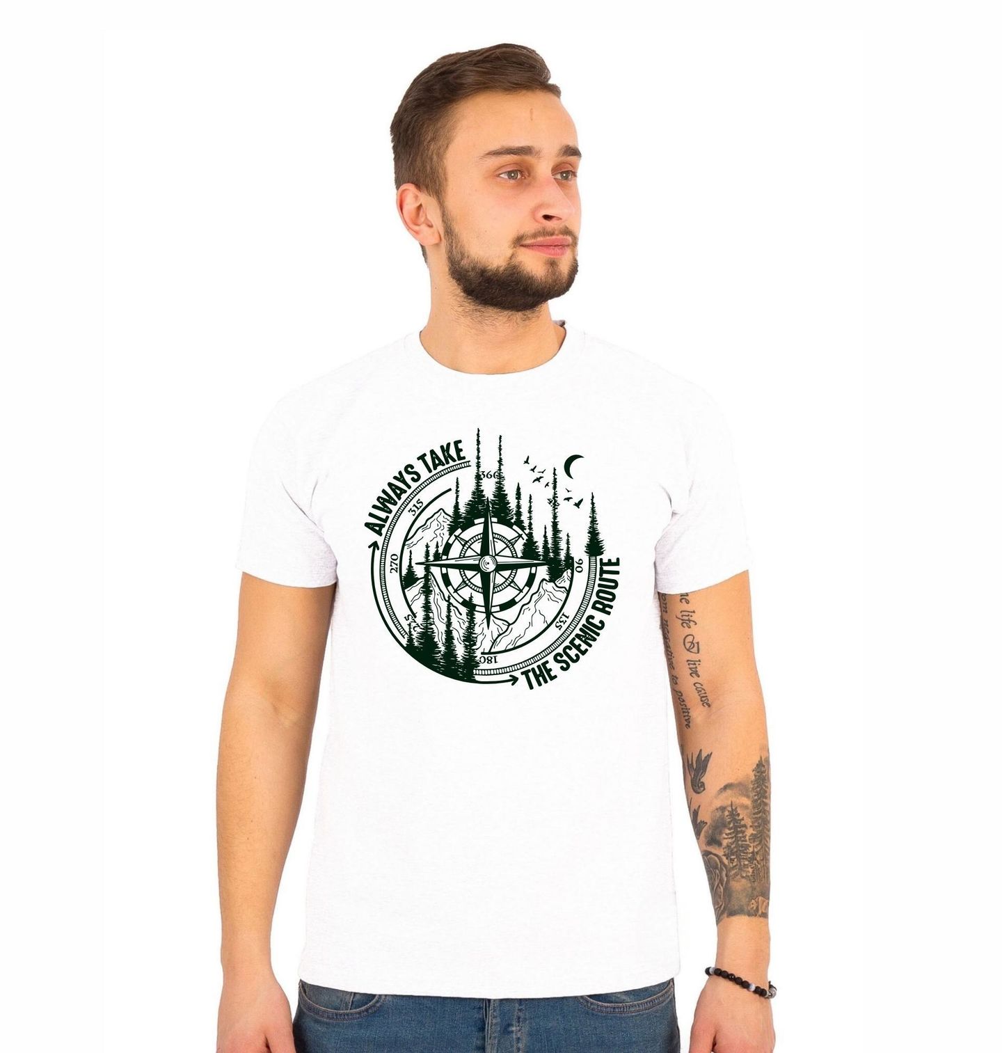 Pánské tričko Dobrodružný Kompas. Motiv kompasu s textem „Always take the scenic route“ (Vždy si vyber krásnější cestu). Lesy a hory symbolizují dobrodružství. Design kompasu je ideální pro cestovatele.