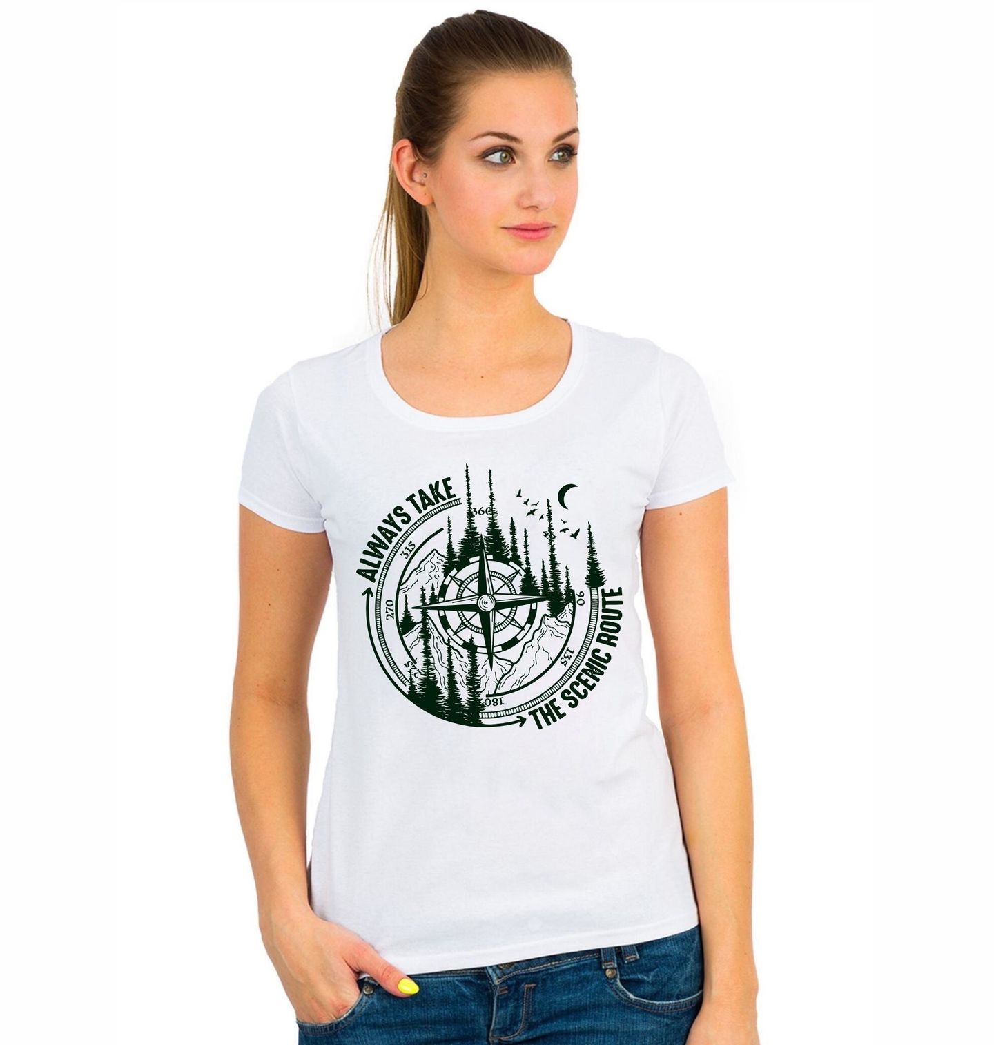 Dámské tričko Dobrodružný Kompas. Motiv kompasu s textem „Always take the scenic route“ (Vždy si vyber krásnější cestu). Lesy a hory symbolizují dobrodružství. Design kompasu je ideální pro cestovatele.