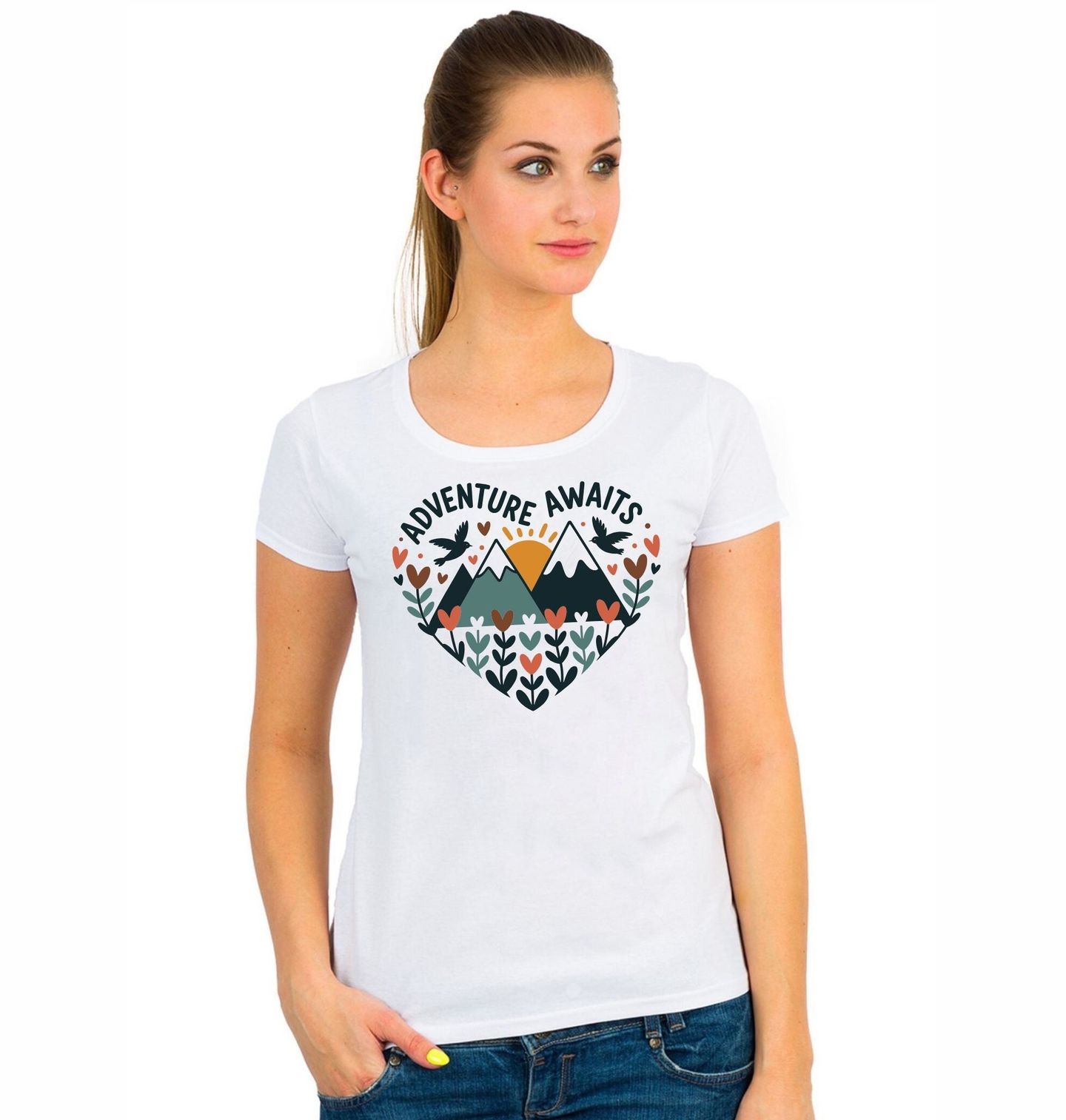 Dámské tričko Dobrodružství čeká Adventure Awaits. Jemný a stylový motiv, který spojuje krásu přírody s romantickým nádechem. Hory, vycházející slunce a květinové prvky vytváří tvar srdce, který symbolizuje lásku k dobrodružství a přírodě. Tento design dokonale vystihuje vášeň pro hiking a objevování nových míst. Motiv je ideální pro všechny, kteří milují turistiku, hory a klid přírody.