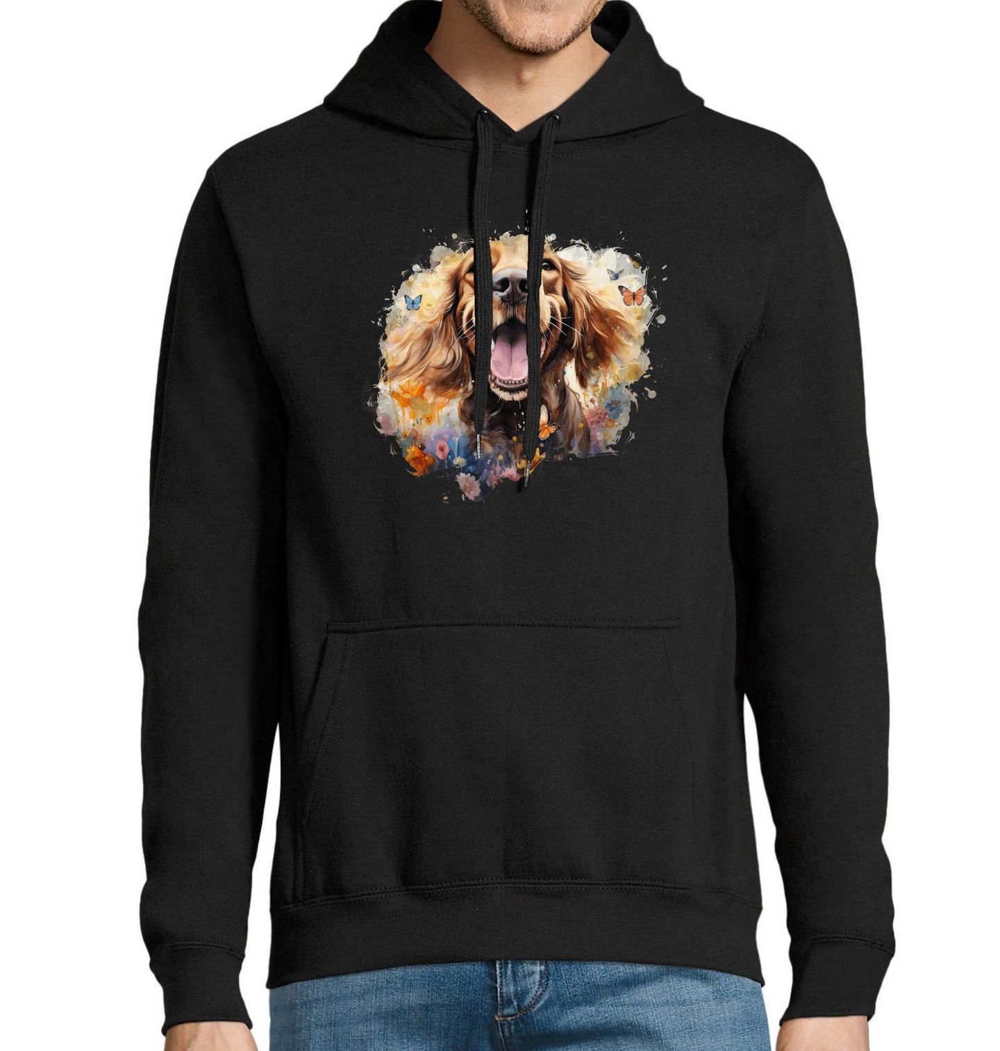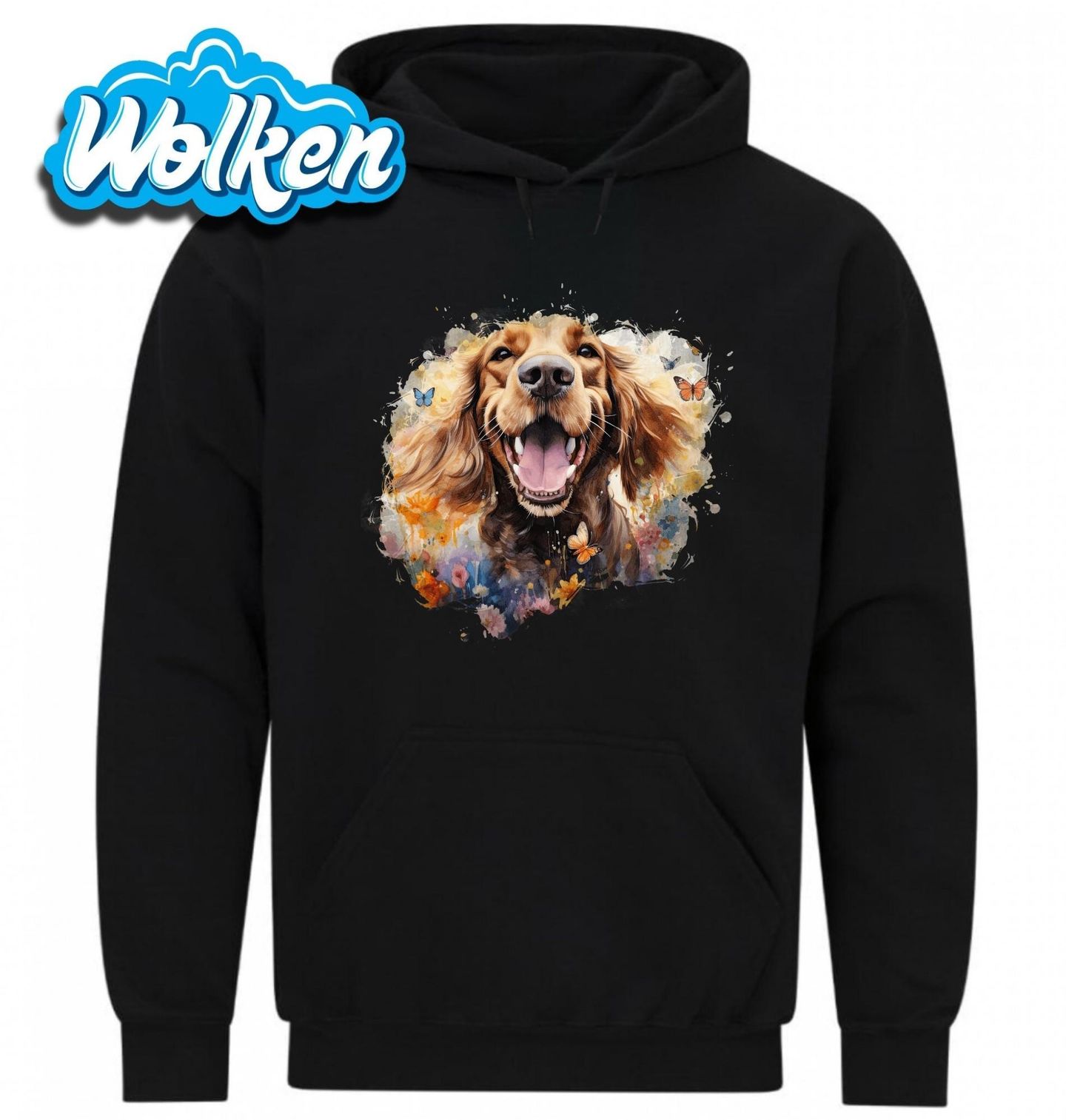 Pánská mikina Dobrodružství s Anglickým kokršpanělem. Tahle exploze štěstí vám zlepší den! Na tomto veselém motivu září Anglický kokršpaněl – spokojený a šťastný pes, obklopený barevnými motýly a květinami. Skvělý design pro každého pejskaře, který ví, že úsměv psa je ta nejčistší radost.