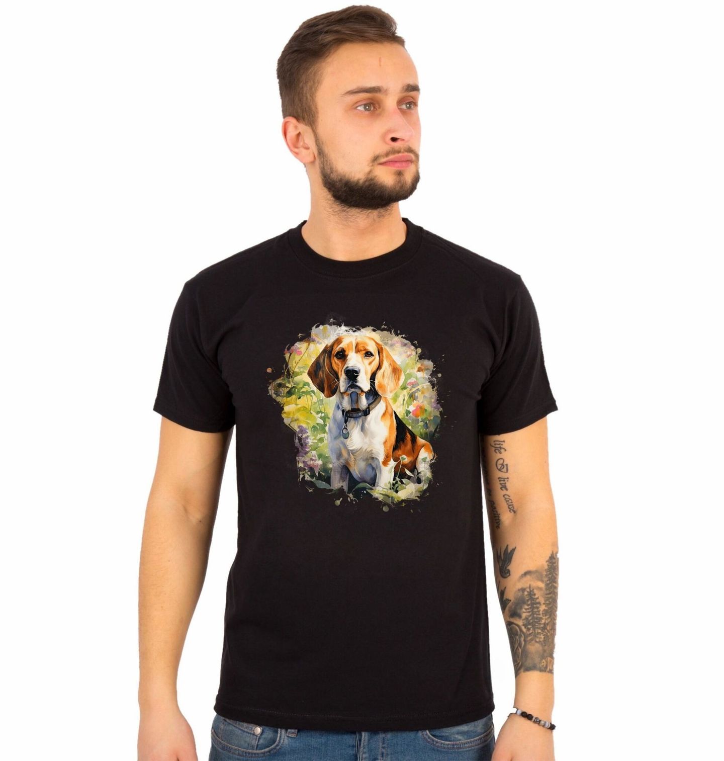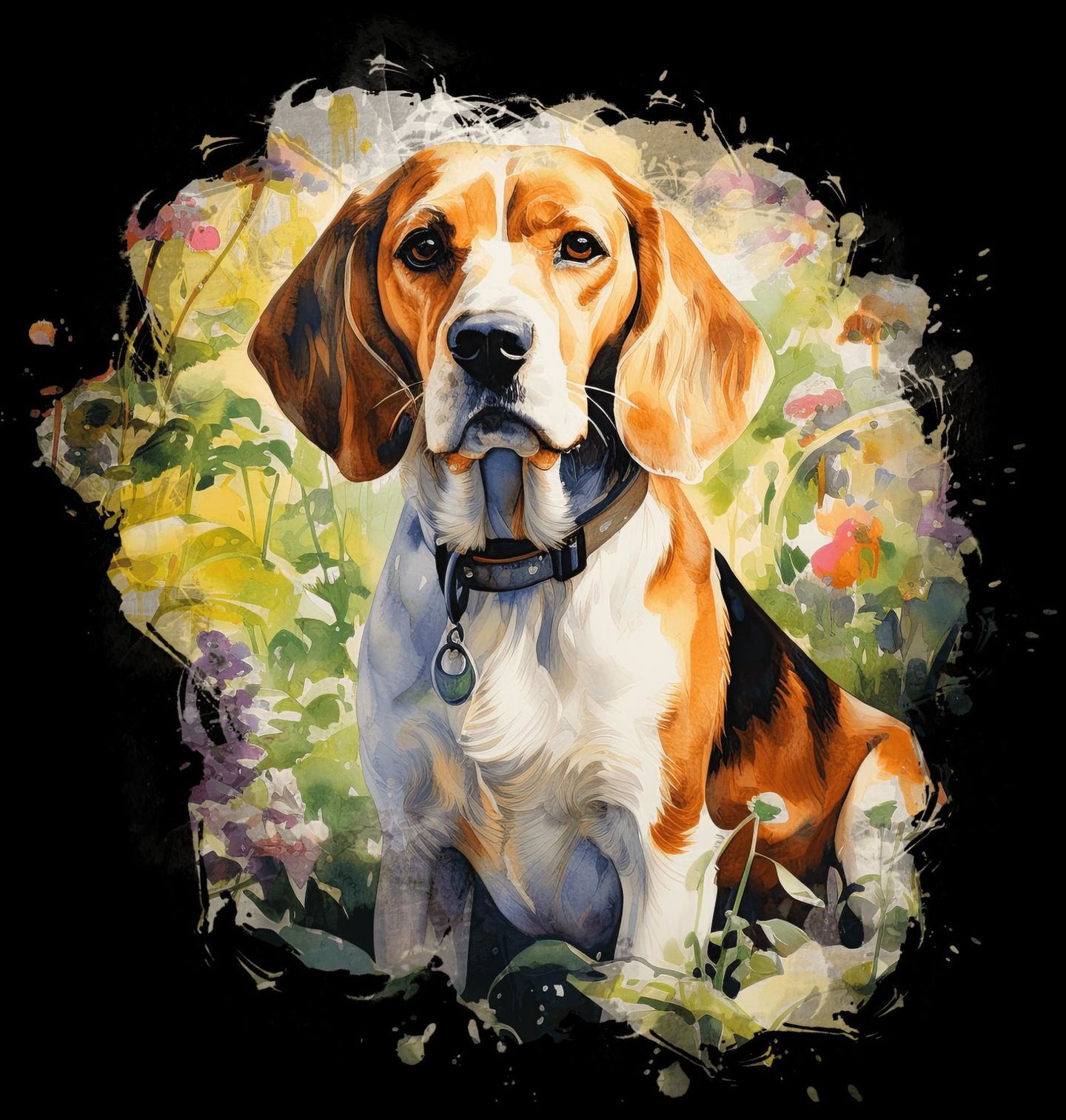 Pánské tričko Dobrodružství s Bíglem. Tento pes bígl sedí mezi květinami a působí přirozeně a jemně. Ilustrace vyzařuje pohodu, přirozenost a jemný vztah ke krajině, který si zamiluje každý pejskař. Dílo osloví milovníky psů, kteří mají blízko k přírodě a ocení decentní, harmonický motiv s osobitým charakterem.
