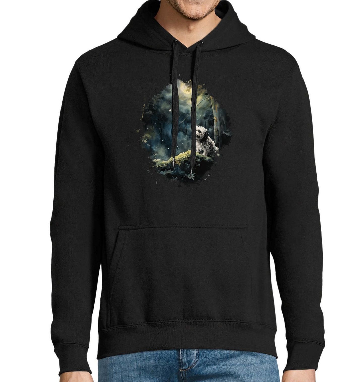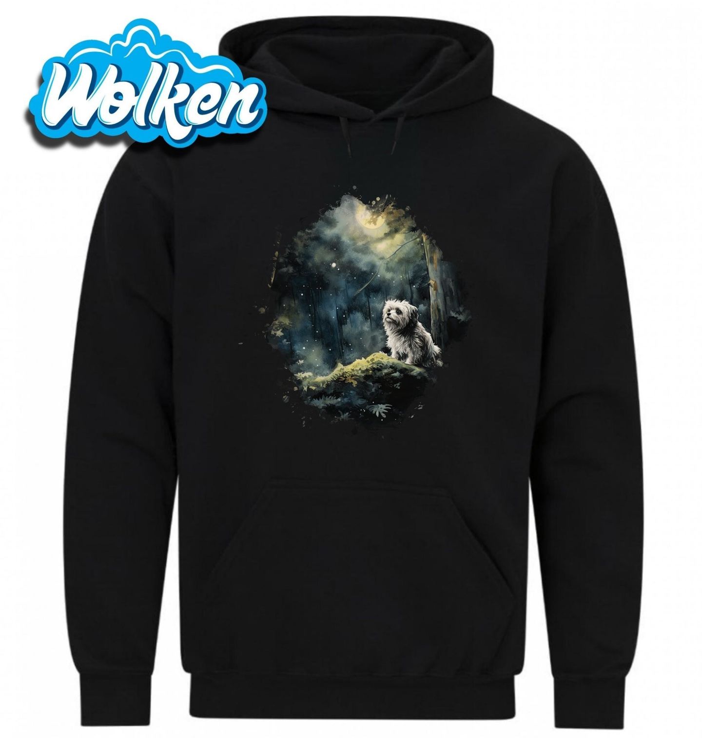 Pánská mikina Dobrodružství s Havanským psíkem. Vychutnejte si kouzlo lesa zalitého měsíčním svitem s tímto nádherným motivem, kde hlavní roli hraje Havanský psík. Tento roztomilý pes stojí osamoceně v tichém nočním lese, jehož atmosféru podtrhuje jemné světlo měsíce a hvězd. Ideální pro každého pejskaře, který miluje spojení přírody a psí věrnosti.