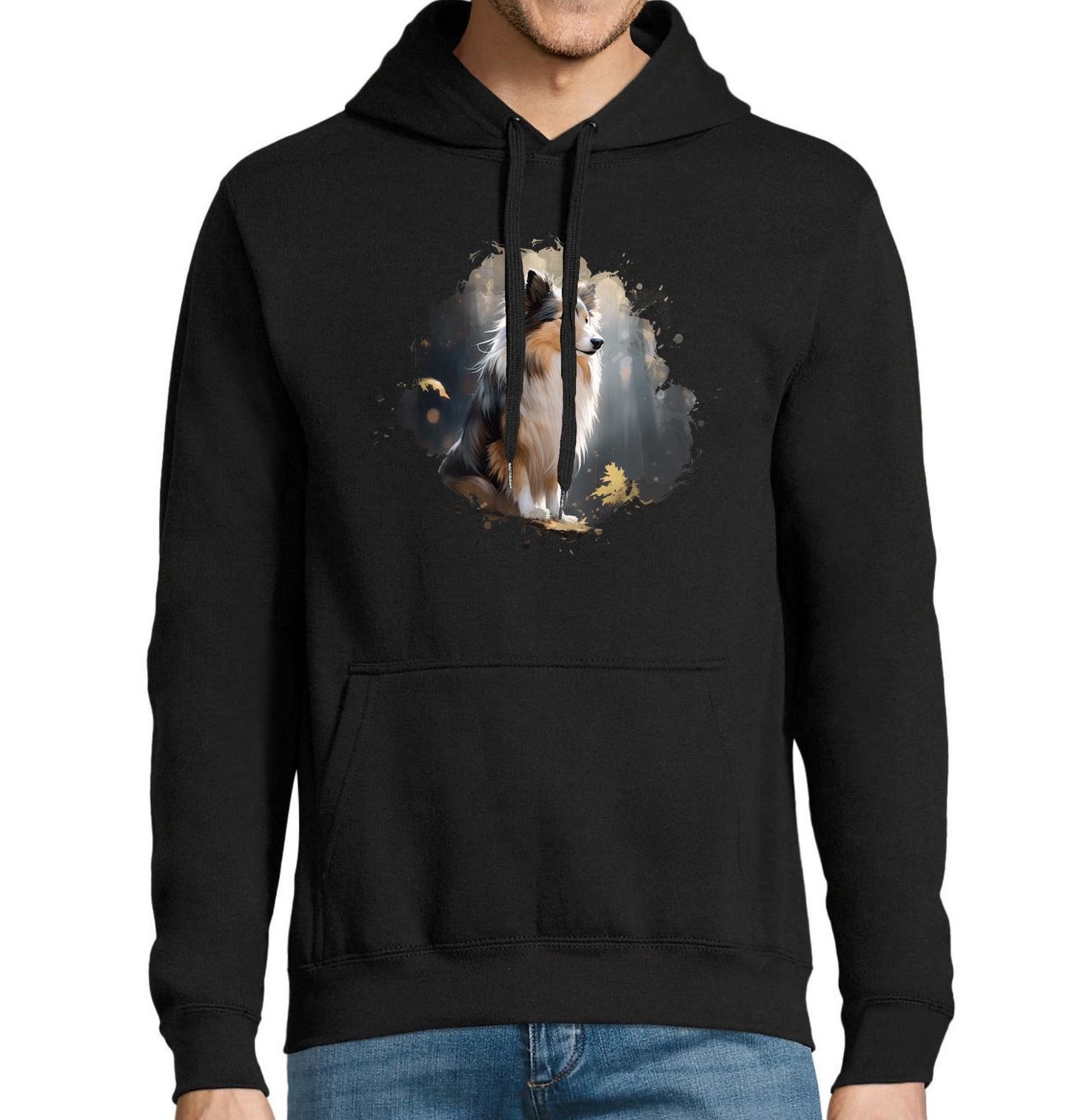 Pánská mikina Dobrodružství se Šeltií. Elegantní a klidná Šeltie (Shetlandský ovčák) zachycená v magickém paprsku světla mezi padajícím listím. Tento motiv oslavuje krásu, inteligenci a jemnost, kterou tento pes ztělesňuje. Perfektní dárek pro každého pejskaře, který miluje podzimní procházky a spojení s přírodou.