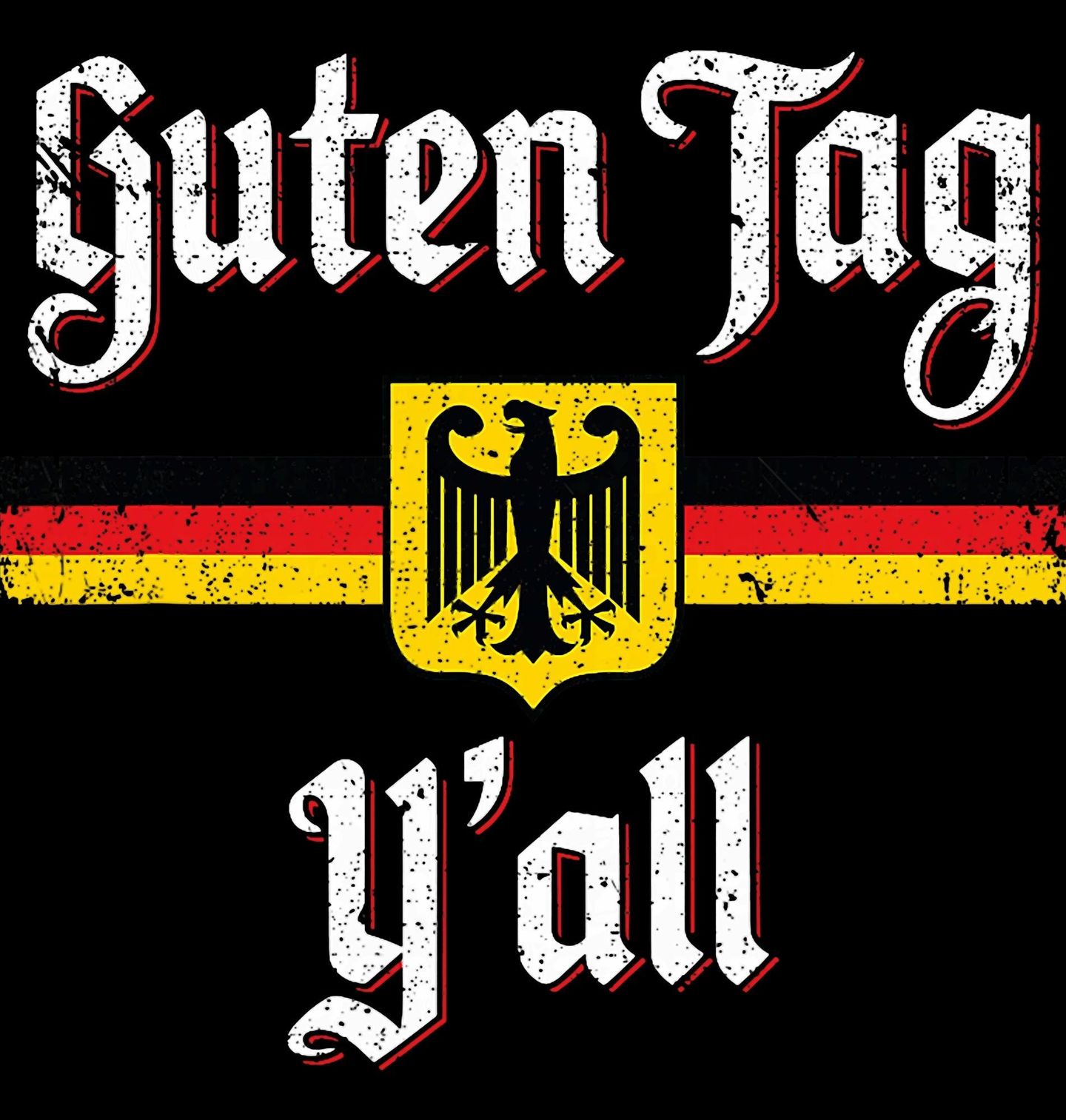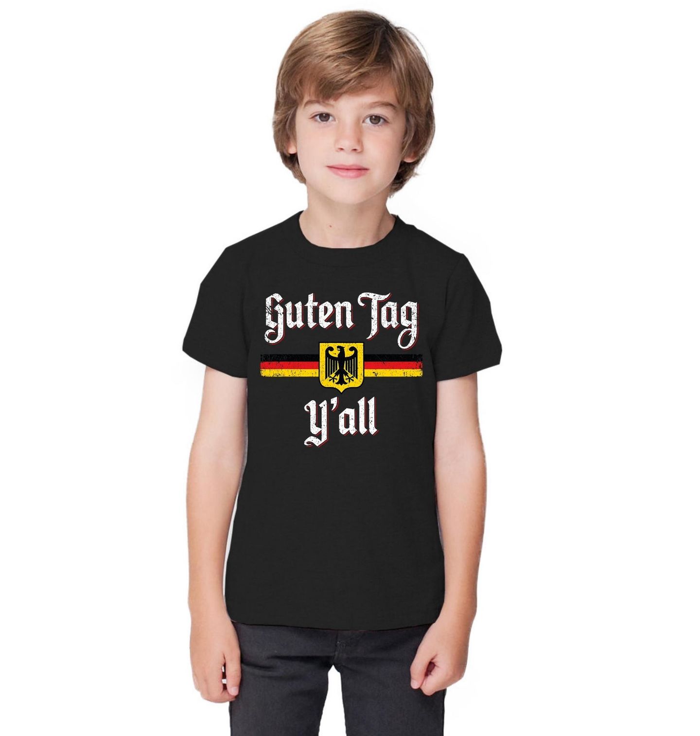 Dětské tričko Dobrý den Všichni Guten Tag Y’all. Originální motiv spojuje německou kulturu s americkým slangem. Text „Guten Tag Y’all“ znamená v překladu „Dobrý den všichni“. Design doplňuje německá vlajka a státní symbol orla, což vytváří zajímavou kombinaci německé tradice a moderního humoru.