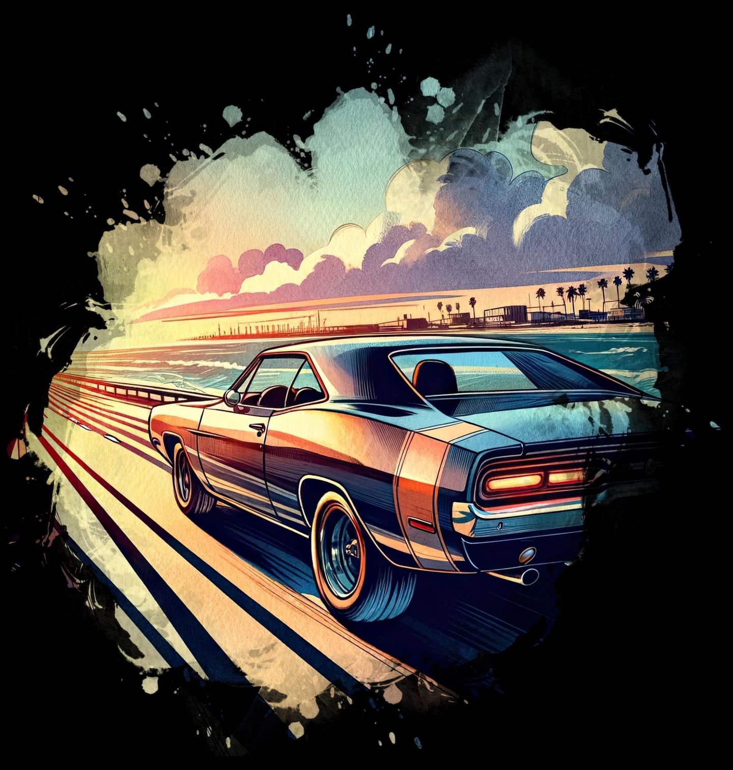 Pánské tričko Dodge Charger Projížďka u Pobřeží. Motiv zachycuje ikonický Dodge Charger při jízdě podél kalifornského pobřeží v atmosféře západu slunce. Silnice mizící v dálce, palmy a teplé barvy evokují svobodu, nekonečné léto a americký road-trip sen. Tento klasický muscle car symbolizuje sílu, rychlost a nespoutaný styl Západního pobřeží. Dodge Charger zde není jen auto – je to legenda americké kultury.