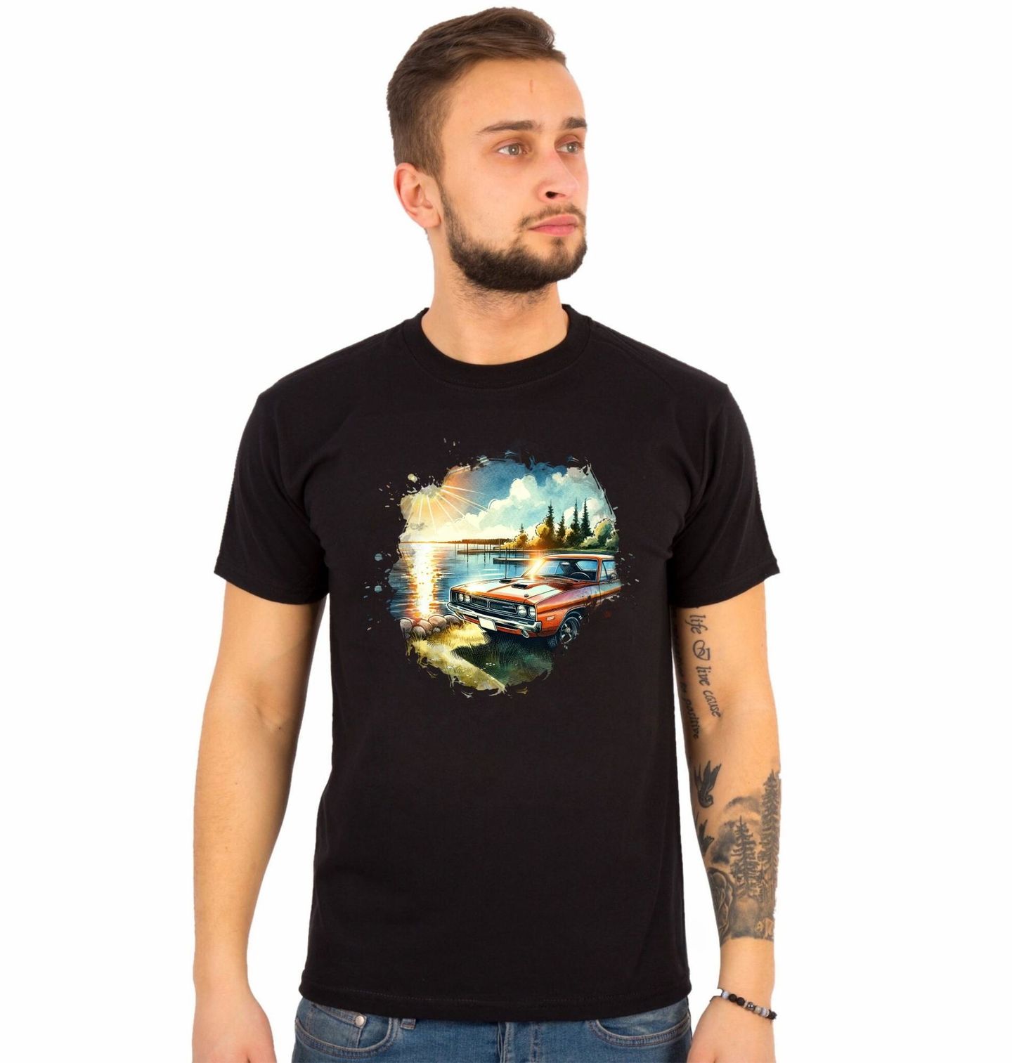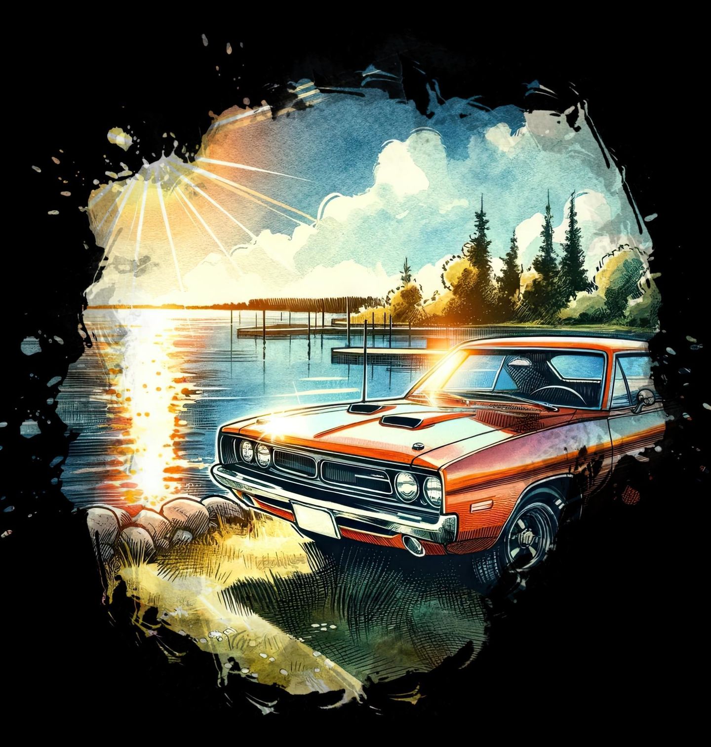 Pánské tričko Dodge Charger u Jezera. Dodge Charger, legendární americký muscle car, který se stal symbolem síly, svobody a nespoutané jízdy. Auto stojí u klidného jezera při západu slunce, což vytváří kontrast mezi divokým charakterem vozu a poklidnou krajinou. Dlouhá kapota, agresivní maska a sportovní linie okamžitě prozradí, že jde o skutečný muscle car, navržený pro výkon i styl.