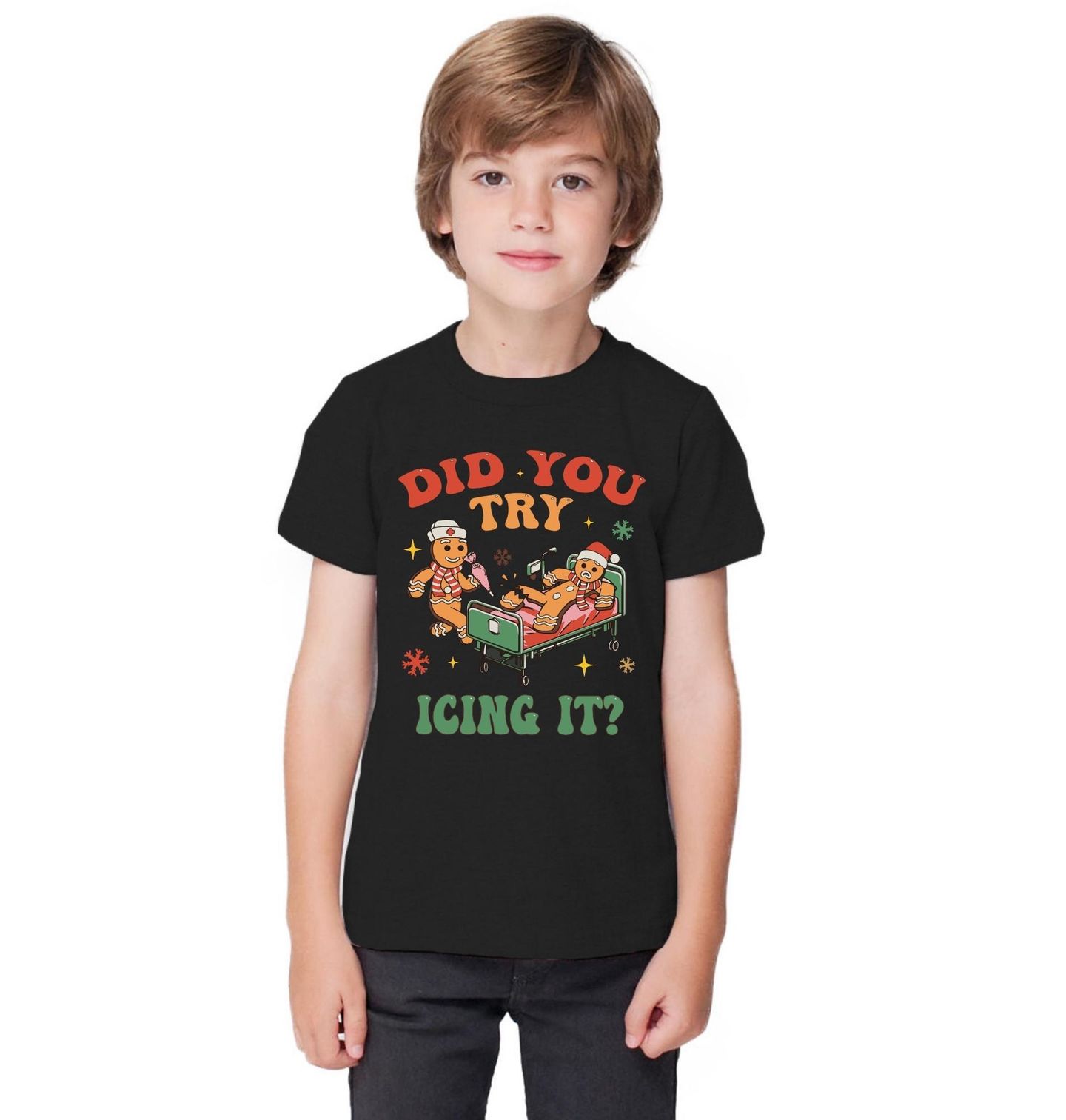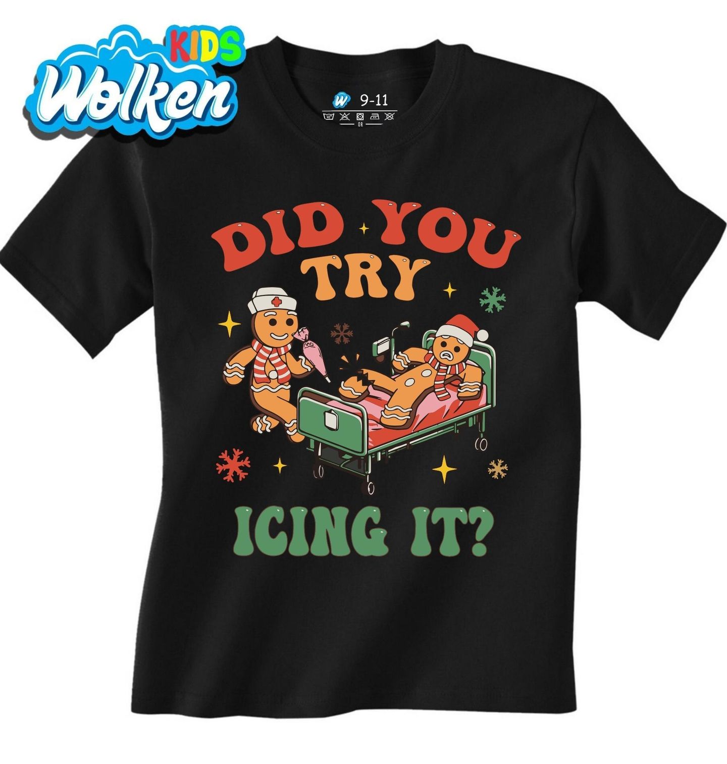 Dětské tričko Doktor Perníček Zkus to polít polevou. „Did you try icing it?“ česky „Zkusil jsi to polít polevou?“ (anglická slovní hříčka – icing = poleva i ledování zranění). Zraněný perníček na nemocničním lůžku a druhý, který se ho snaží zachránit polevou, je geniální spojení humoru a vánoc. Vánoce nemusí být jen o romantice a cukroví.