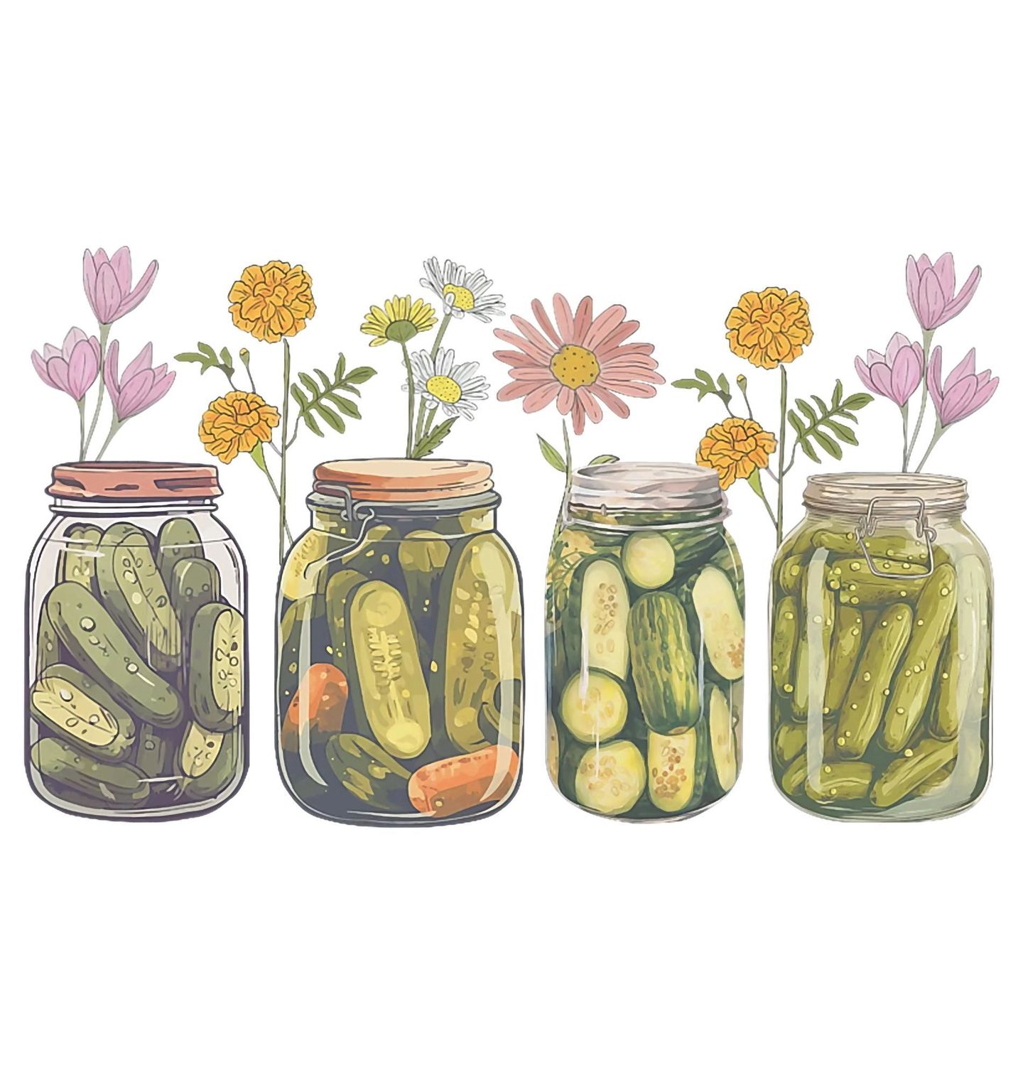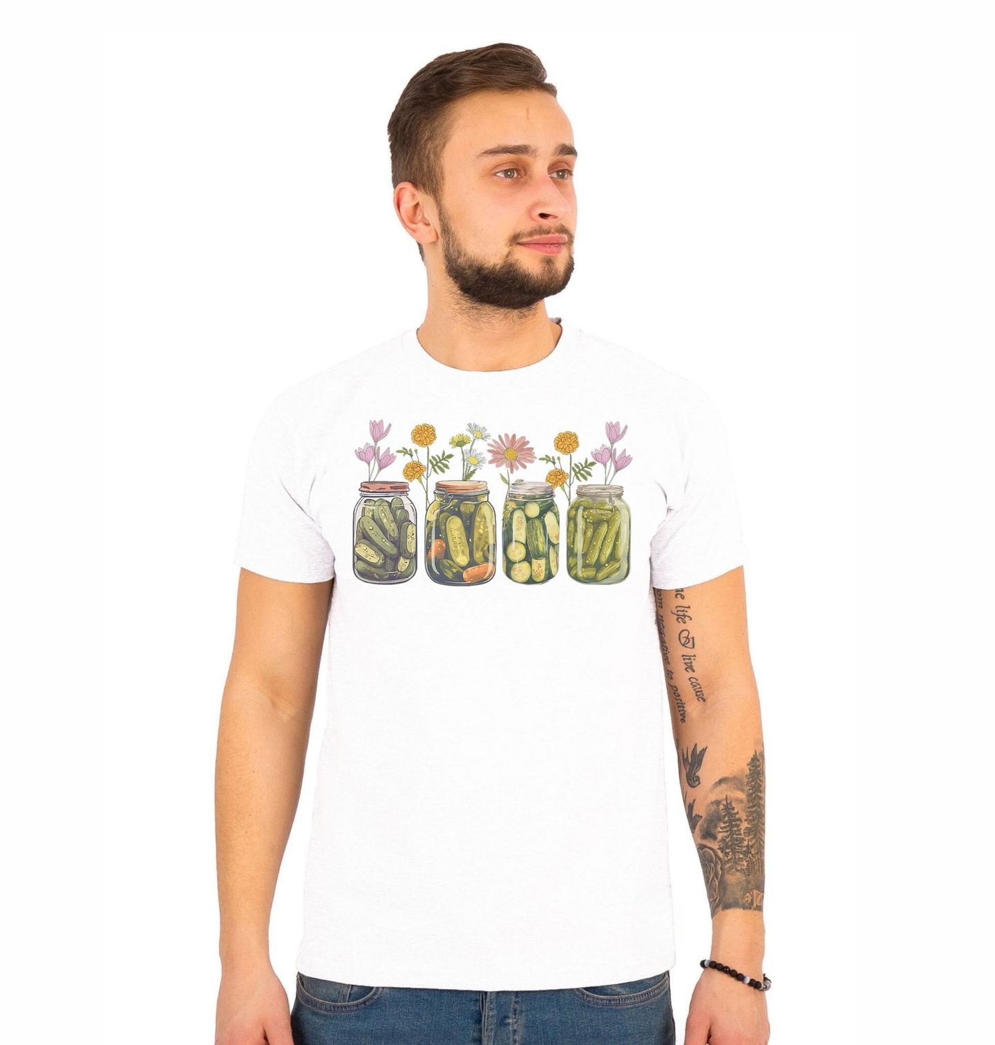 Pánské tričko Domácí Nakládané Okurky. Jemná ilustrace zobrazuje sklenice plné nakládaných okurek doplněné květinami a bylinkami. Tento design evokuje atmosféru domácí kuchyně, tradičního zavařování a poctivých receptů.