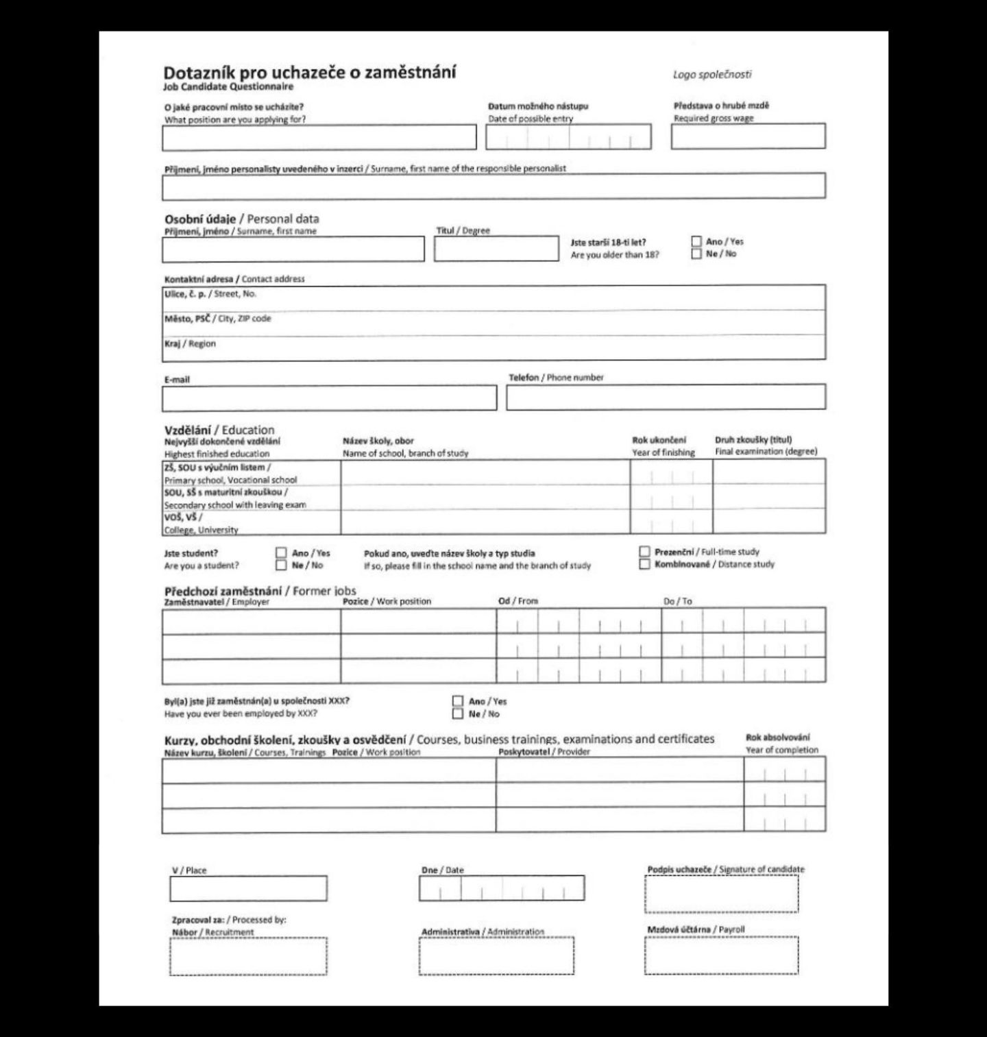 Pánské tričko Dotazník pro uchazeče o zaměstnání. Motiv Dotazník pro uchazeče o zaměstnání vtipně převádí obyčejný náborový formulář do světa humoru a memů. Tato parodie klasického HR papírování (Job Candidate Questionnaire) v češtině i angličtině pobaví všechny, kdo znají nekonečné tabulky, kolonky a korporátní byrokracii. Ideální pro milovníky meme kultury, kancelářských vtípků a lehce ironického nadhledu nad každodenní prací.