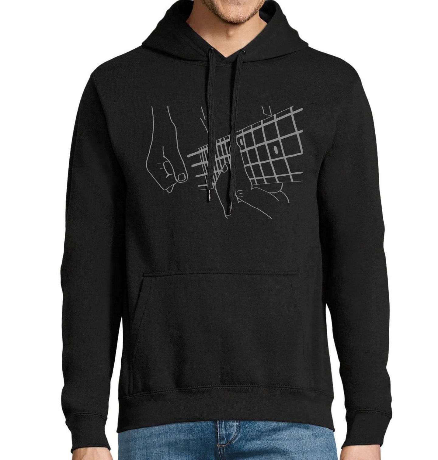 Pánská mikina Dotek Strun. Minimalistický a přesto silný motiv zachycuje okamžik, kdy ruka rozeznívá struny a kytara ožívá pod prsty hudebníka. Čistá liniová kresba na tmavém podkladu vytváří moderní, nadčasový design, který ocení každý milovník hudby. Tento motiv vyjadřuje soustředění, cit a energii, kterou přináší kytara při každém tónu.