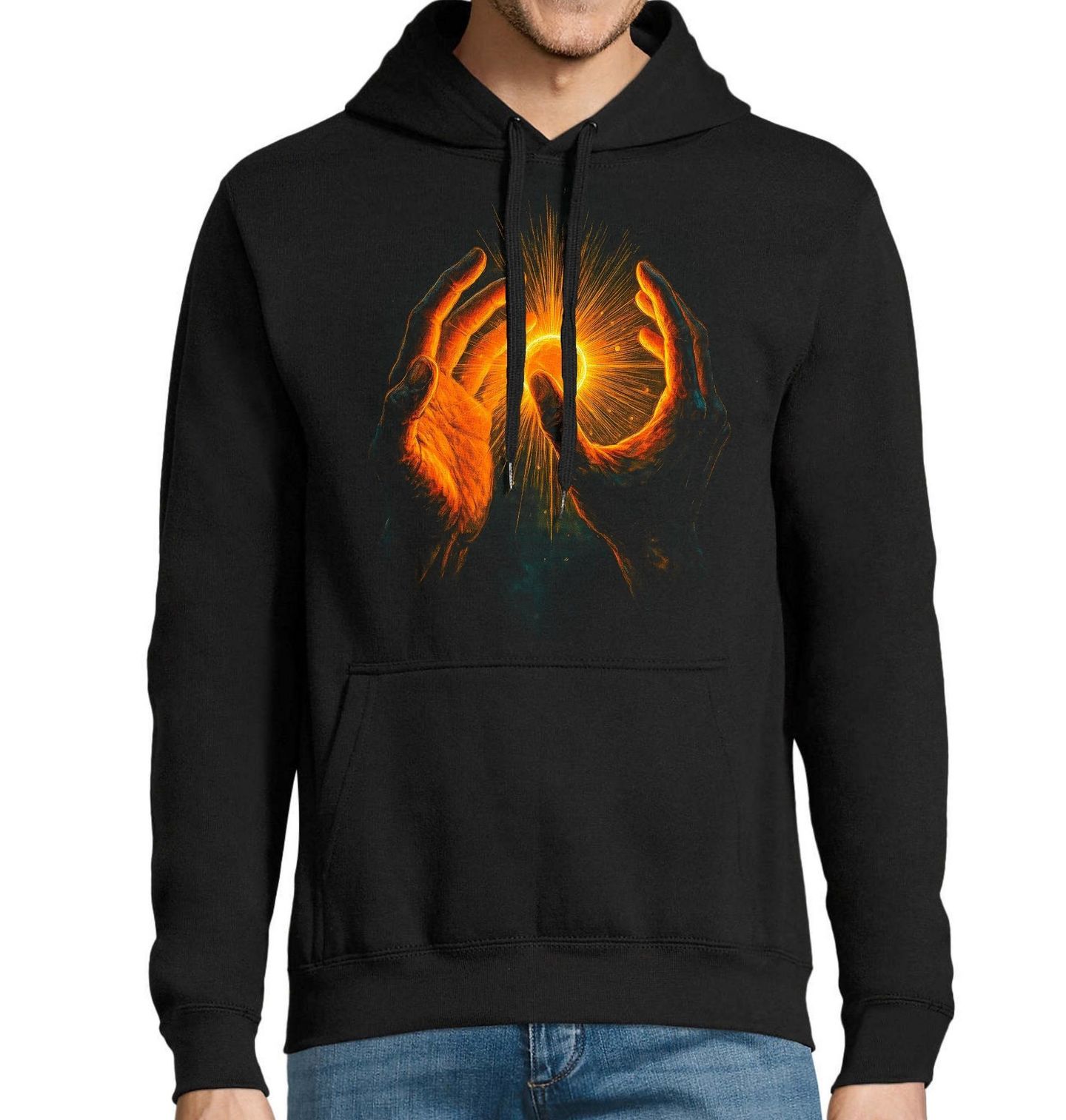 Pánská mikina Dotek Světla v Temnotě. Silný a symbolický motiv zachycuje okamžik, kdy lidské ruce drží a chrání zářící světlo. Tento design představuje naději, energii a vnitřní sílu, která vychází zevnitř a dokáže rozjasnit i tu největší tmu. Detailní zpracování rukou a intenzivní záře dodávají motivu hloubku a emoce. Světlo zde symbolizuje život, inspiraci i nový začátek – něco, co máme každý ve svých rukou.
