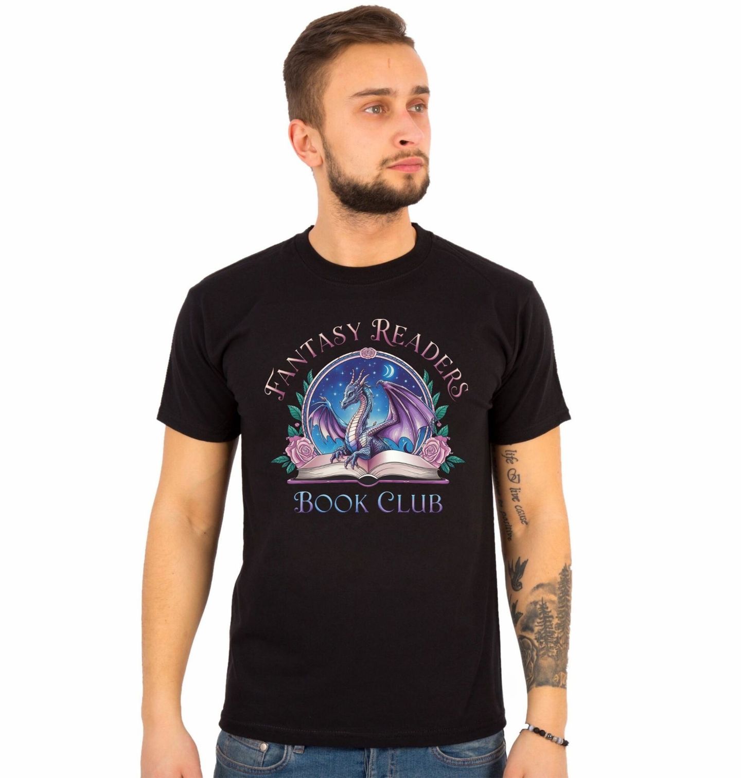 Pánské tričko Dračí Klub Čtenářů. "Fantasy Readers Book Club" je jako stvořený pro každého fanouška fantasy světa, knih a kouzelných příběhů. Krásně ilustrovaný drak sedící na otevřené knize pod noční oblohou symbolizuje sílu fantazie a dobrodružství, které přináší každá stránka.