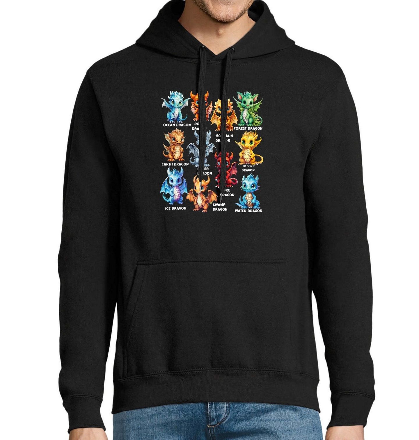 Pánská mikina Dračí Mláďata Živlů. Objevte kouzlo fantasy světa s tímto barevným tričkem, na kterém najdete hned 11 roztomilých druhů draků – od ledového draka přes lesního až po ohnivého a vodního. Každý drak má svůj unikátní design a barvy, které z trička dělají nepřehlédnutelný kousek.
