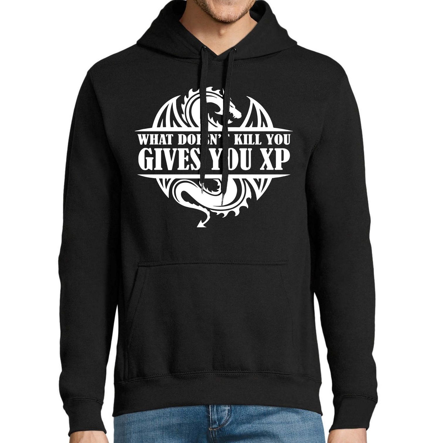 Pánská mikina Drak Co tě nezabije, dá ti XP Dungeons & Dragons. Design s drakem a textem „What doesn’t kill you gives you XP“ znamená „Co tě nezabije, dá ti zkušenosti“. Drak zde symbolizuje výzvy a sílu, zatímco hláška vychází z herní logiky získávání XP bodů. Dungeons & Dragons (zkráceně DnD) je stolní fantasy hra na hrdiny.