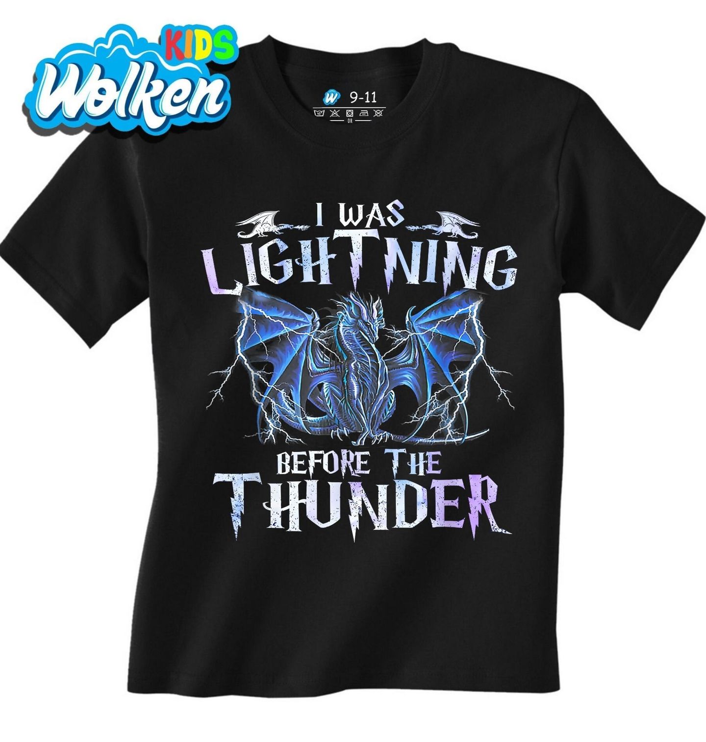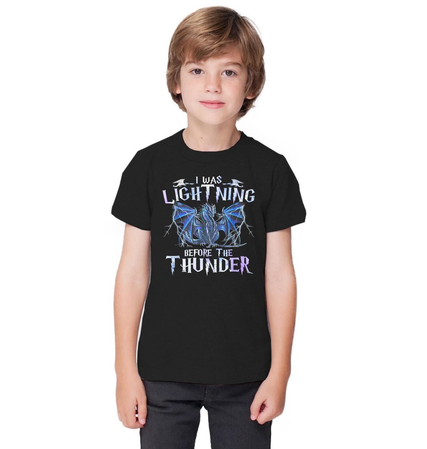 Dětské tričko Drak Hromovládce. "I was lightning before the thunder" česky „Byl jsem blesk dřív, než zazněl hrom“ zobrazuje majestátního modrého draka obklopeného blesky. Drak je symbolem síly, rychlosti a nadpřirozené energie, která přichází ještě před hromem. Ideální design pro fanoušky fantasy.