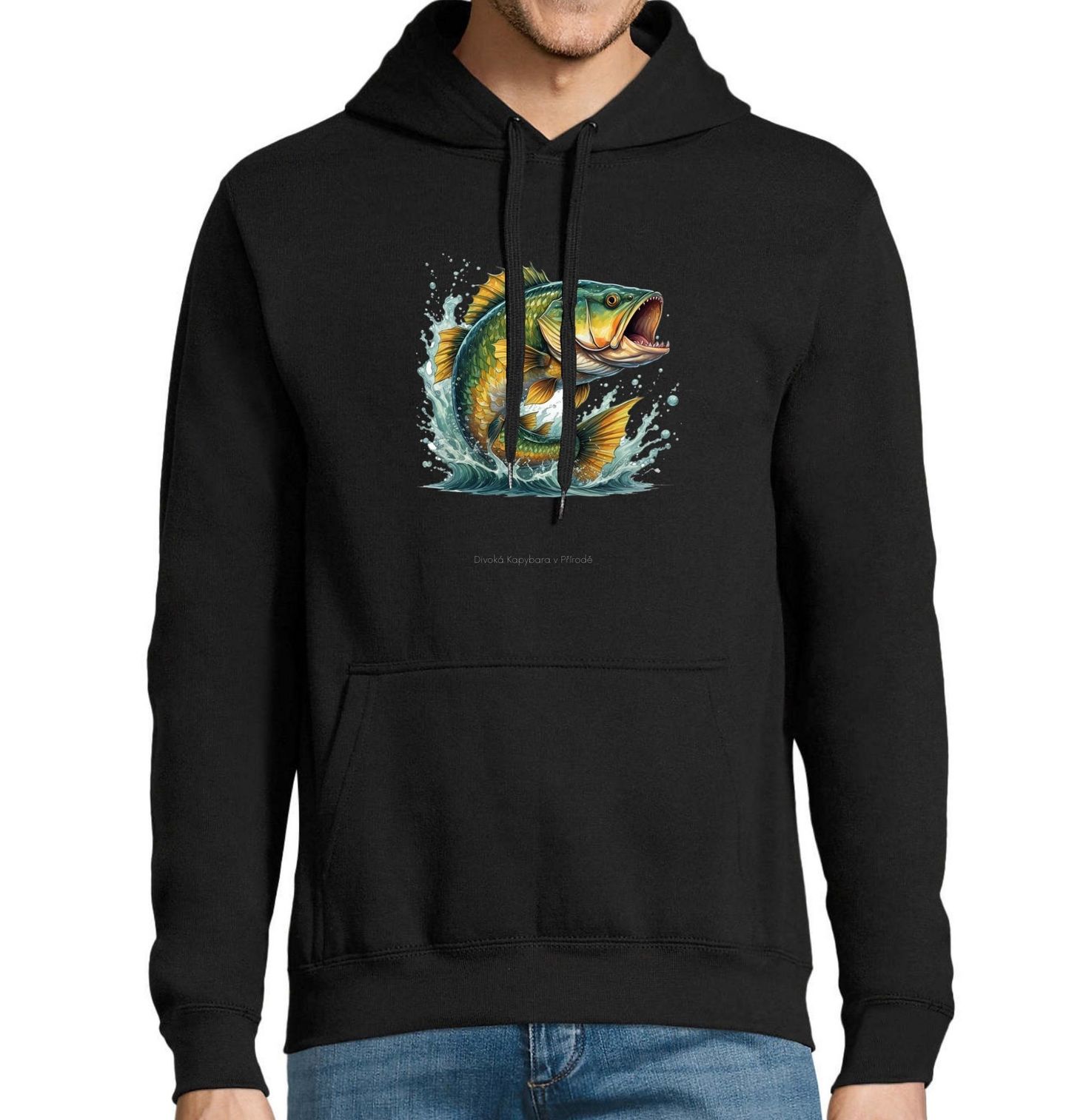 Pánská mikina Dravá Ryba Okoun. Působivý motiv zlatavého okouna v plném skoku nad hladinou osloví každého vášnivého rybáře. Detailní ilustrace zachycuje sílu a dravost této ikonické ryby, která je snem každého, kdo miluje sportovní rybaření.
