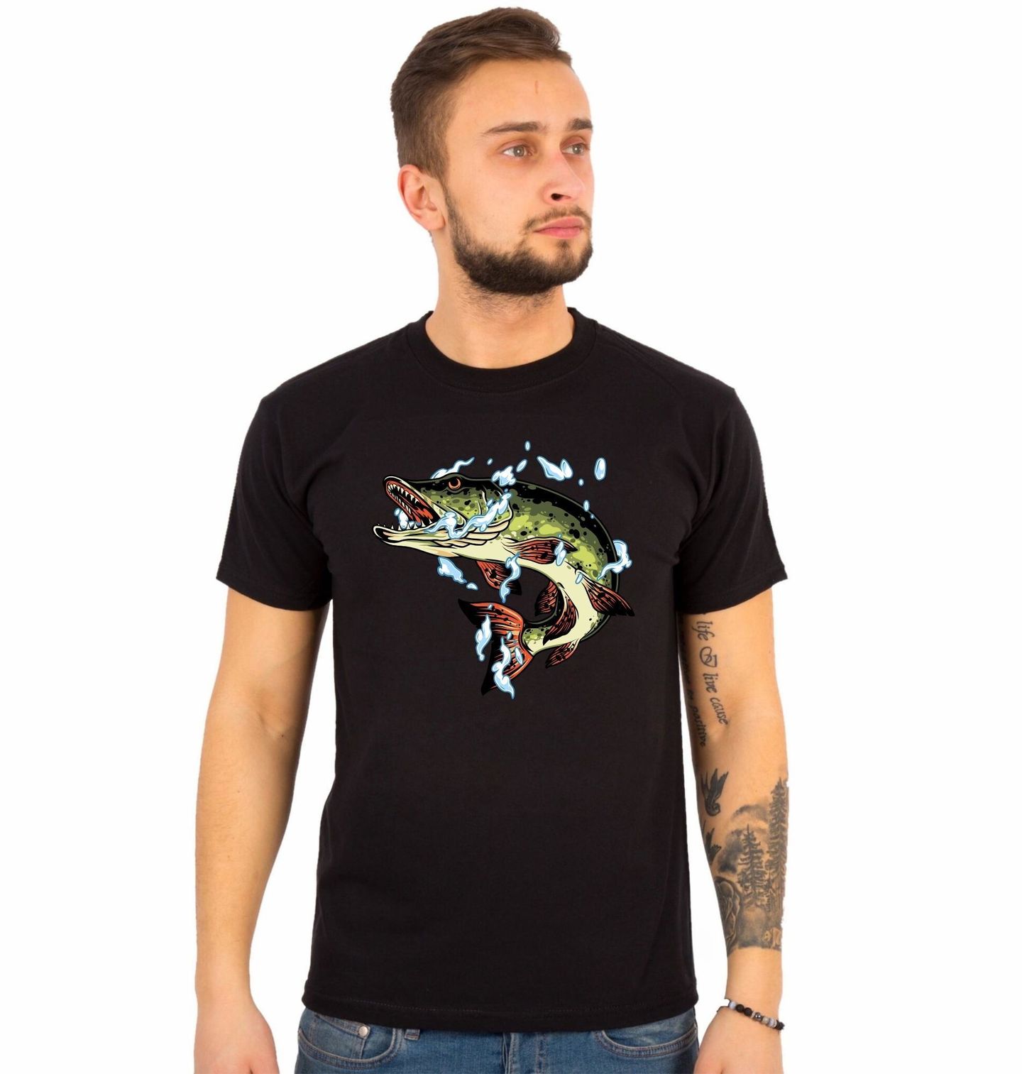 Pánské tričko Dravá Štika obecná. Dynamický motiv zachycuje štiku obecnou (Northern pike) v okamžiku prudkého výpadu nad hladinu. Tento ikonický dravec je snem i výzvou, kterou zná každý, pro koho je rybaření životním stylem. Síla, rychlost a nekompromisní útok – přesně taková je štika, ryba, která budí respekt u každého rybáře.
