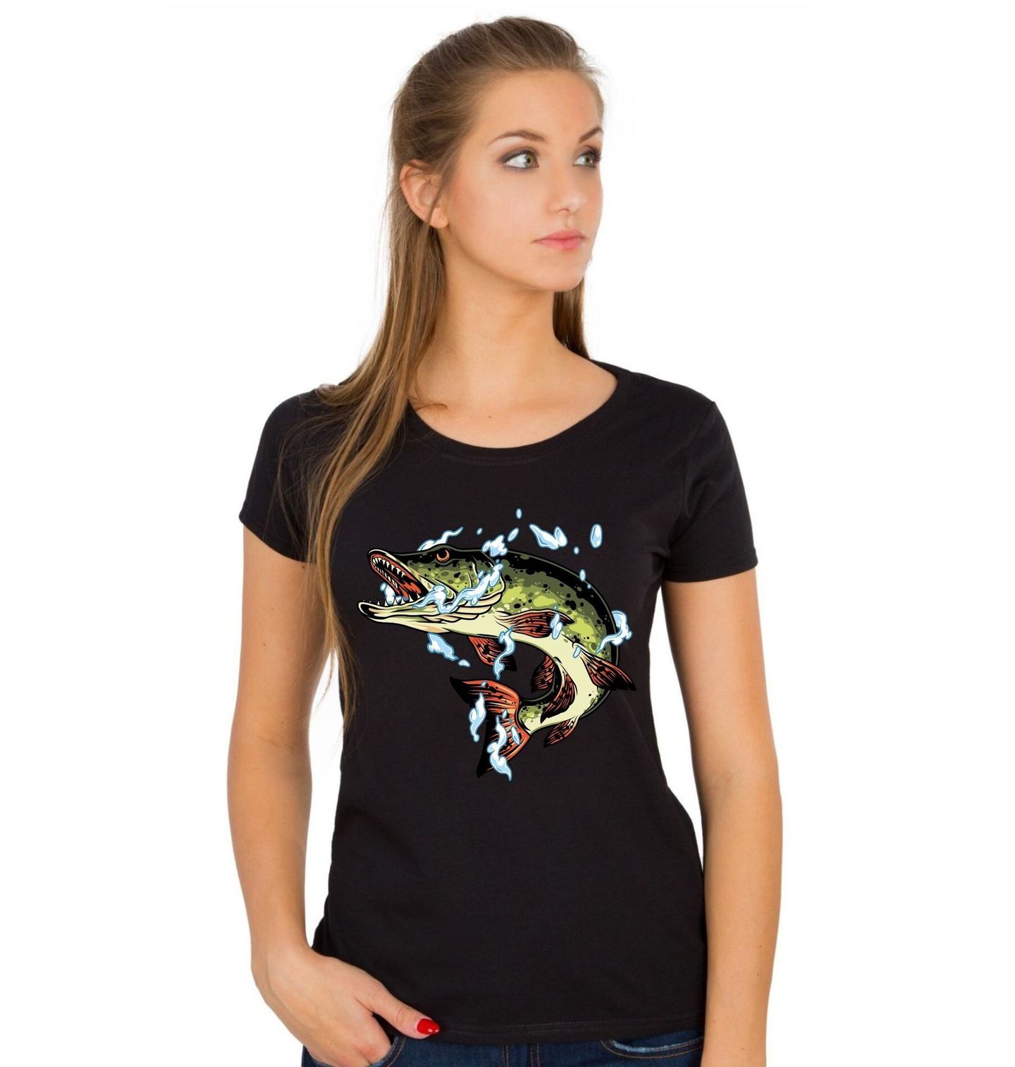 Dámské tričko Dravá Štika obecná. Dynamický motiv zachycuje štiku obecnou (Northern pike) v okamžiku prudkého výpadu nad hladinu. Tento ikonický dravec je snem i výzvou, kterou zná každý, pro koho je rybaření životním stylem. Síla, rychlost a nekompromisní útok – přesně taková je štika, ryba, která budí respekt u každého rybáře.