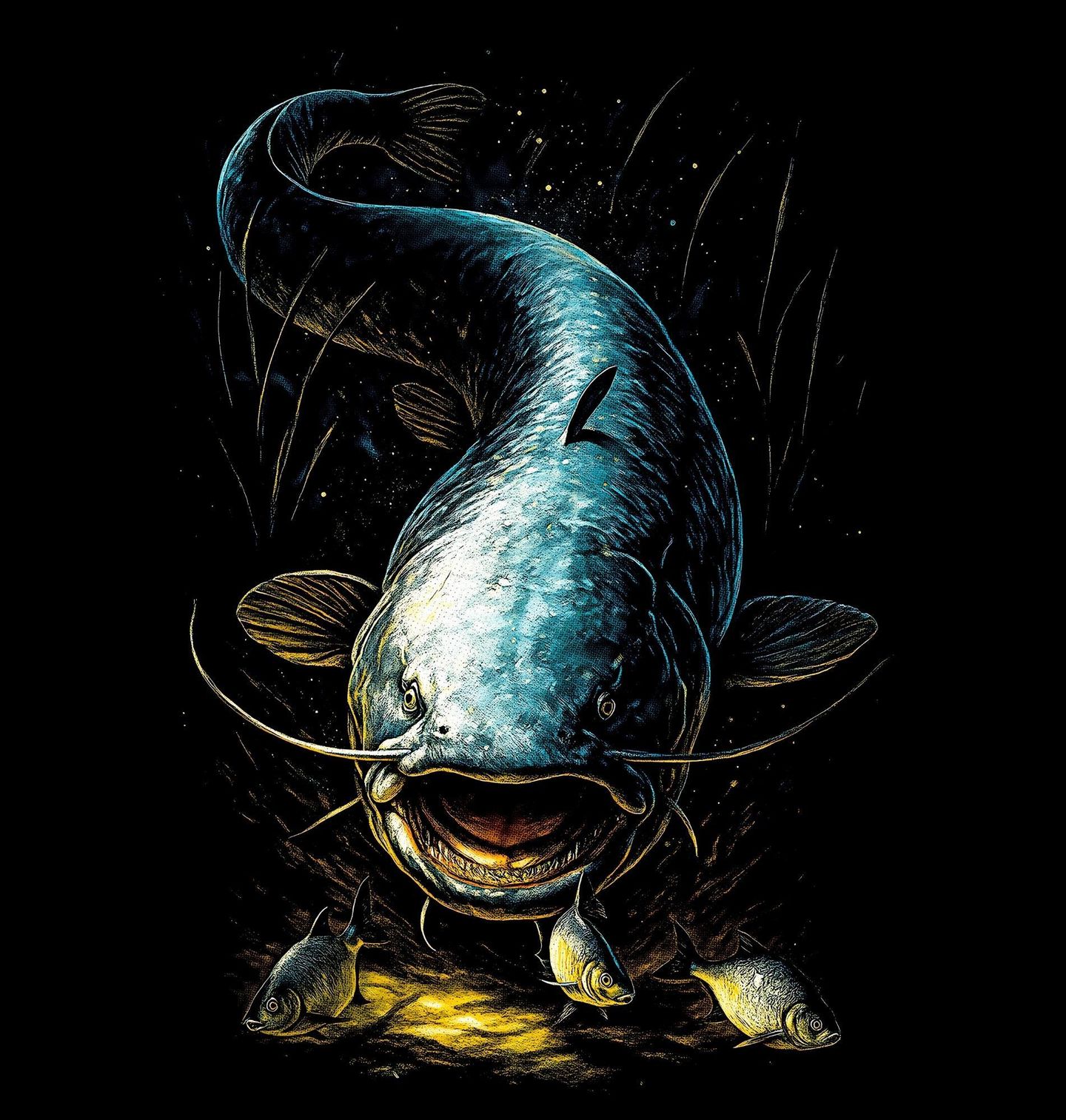 Dětské tričko Dravý Sumec velký. Majestátní sladkovodní ryba a skutečný král řek. Tento dravý obr je symbolem trpělivosti, síly a respektu k vodnímu živlu. Ilustrace zdůrazňuje jeho mohutné tělo, typické vousky a tichý pohyb v temných hlubinách, kde číhá na kořist. Design je ideální pro každého, koho baví rybaření a kdo ví, že právě rybář často čeká dlouhé hodiny na jediný nezapomenutelný záběr.