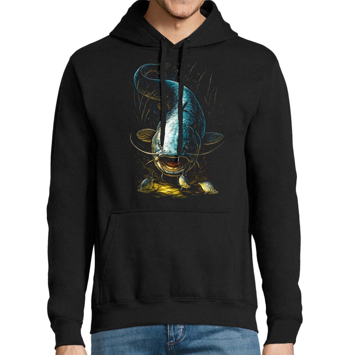 Pánská mikina Dravý Sumec velký. Majestátní sladkovodní ryba a skutečný král řek. Tento dravý obr je symbolem trpělivosti, síly a respektu k vodnímu živlu. Ilustrace zdůrazňuje jeho mohutné tělo, typické vousky a tichý pohyb v temných hlubinách, kde číhá na kořist. Design je ideální pro každého, koho baví rybaření a kdo ví, že právě rybář často čeká dlouhé hodiny na jediný nezapomenutelný záběr.