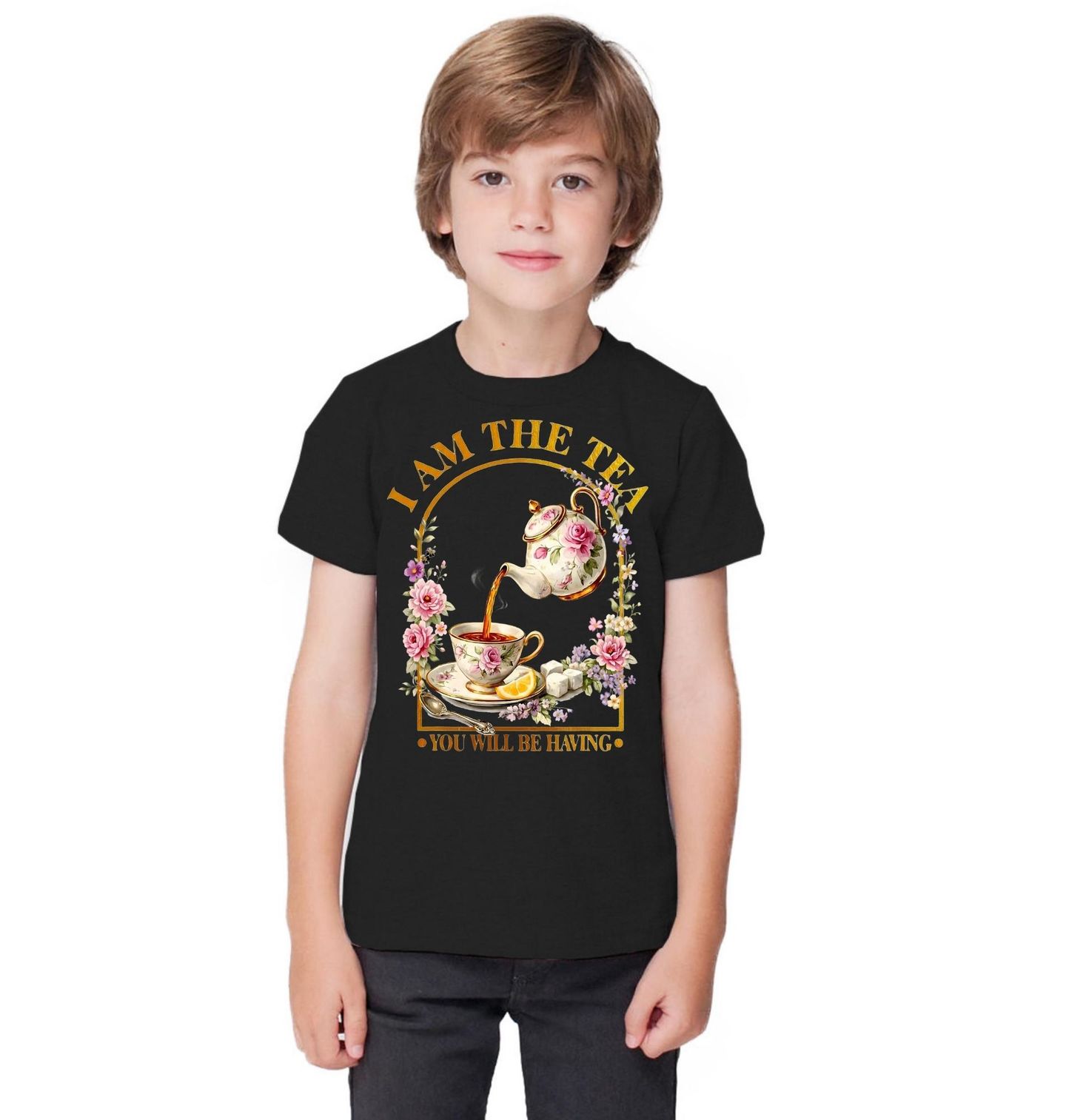 Dětské tričko Drby u Čaje I am the tea you will be having. I am the tea you will be having česky Já jsem ten čaj, který budeš pít. Elegantní a jemný motiv, který spojuje lásku k čaji a pořádné drby. Květinový porcelán, šálek horkého čaje a sladké detaily vytváří dokonalou atmosféru klidného posezení – ideálně s kamarádkou a dobrou konverzací. „The tea“ v angličtině neznamená jen čaj, ale taky slangově drby / gossip